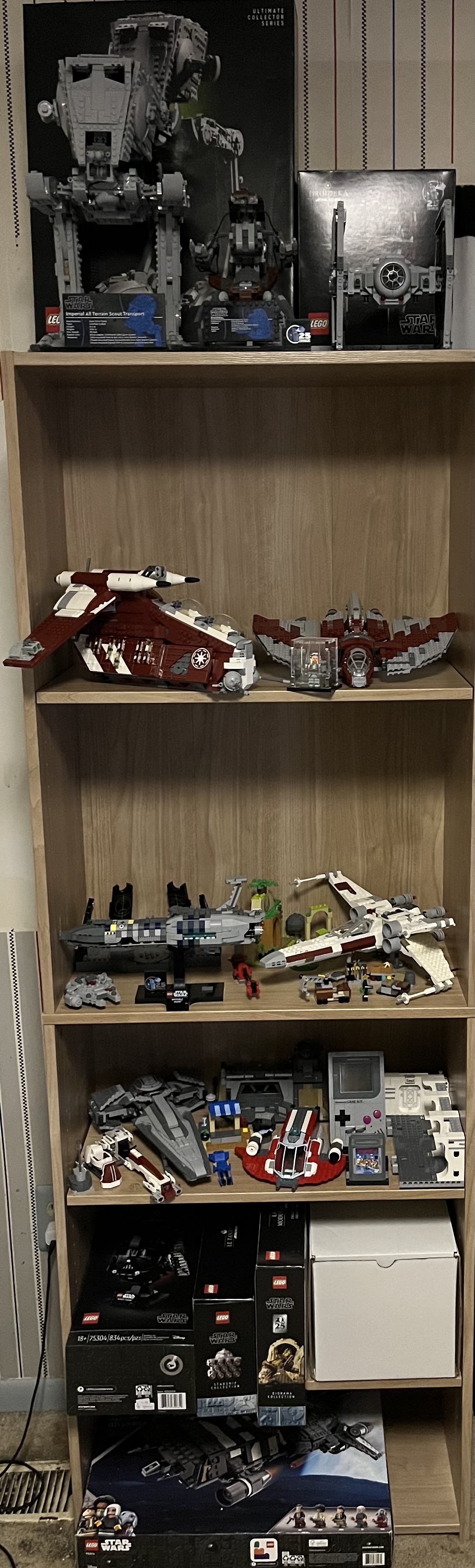 >>11665927The ot shelf is a little bare by comparison. Working towards a palps throne room but the space adjacent sets will need a new home first.