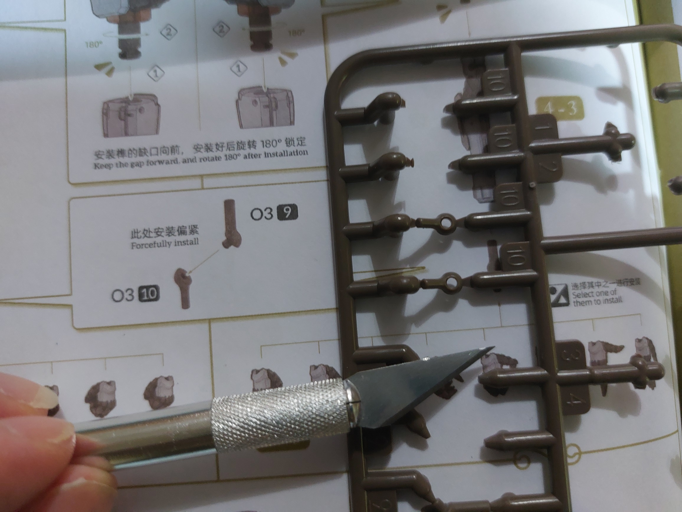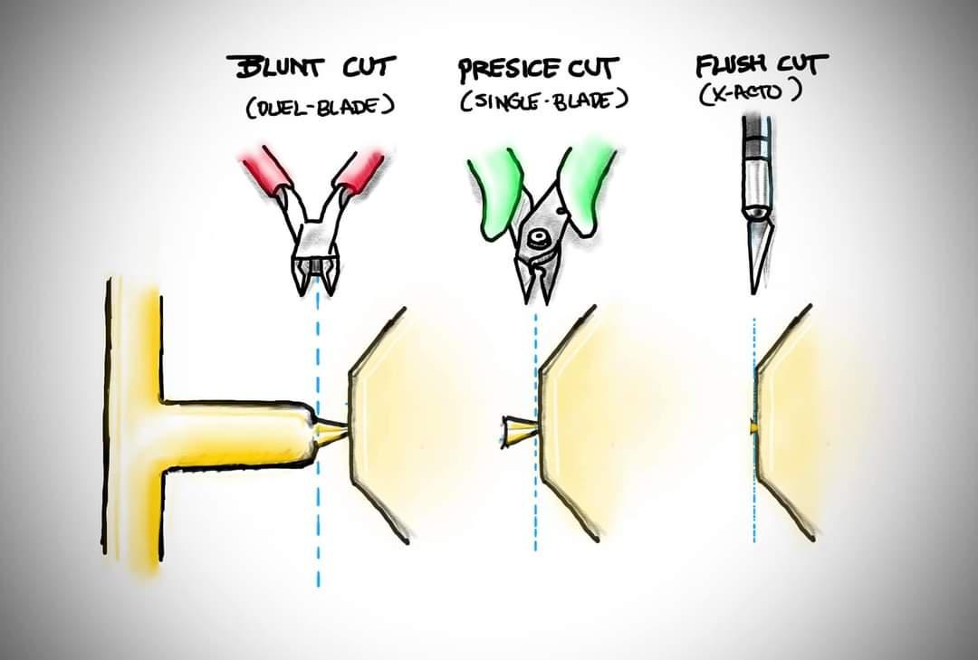 with a scalpel or hobby knife you mainly wanna use it for shaving off the last millimeter of plastic or so after cutting it short with your nippers, just to get a smooth surface