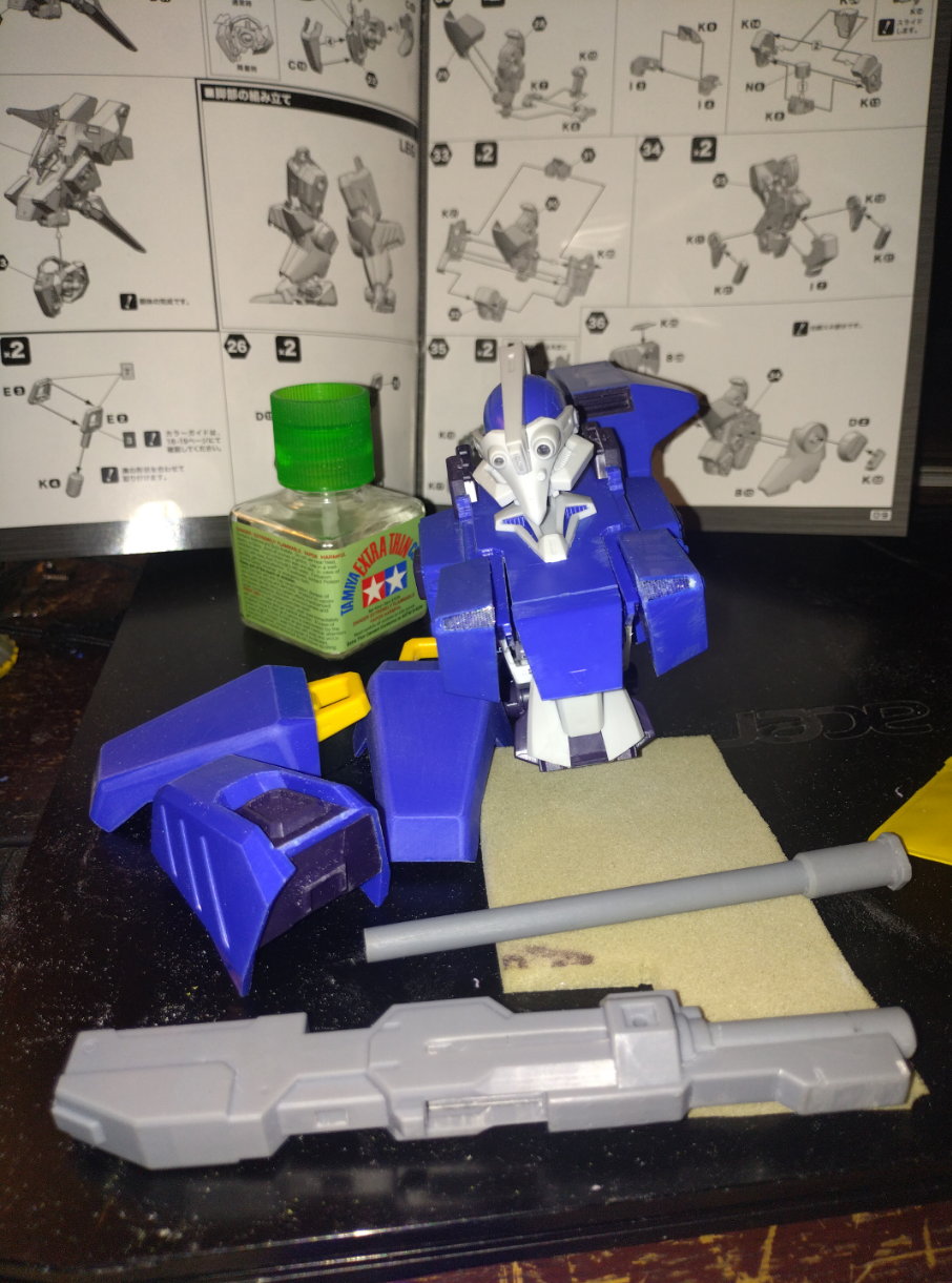 This is the Volks 1/24 Testarossa from Votoms Blue Knight Berserga. Im planning on adding this 3d printed 1/100 cannon to the back, and adding smoke launchers to the left of the chest and a small gatling gun to the right. The paint scheme will be in Melkia army colors (Purple). The chest has the worse fitting issues. I hope the hand scale frame arms girl will fit in this.