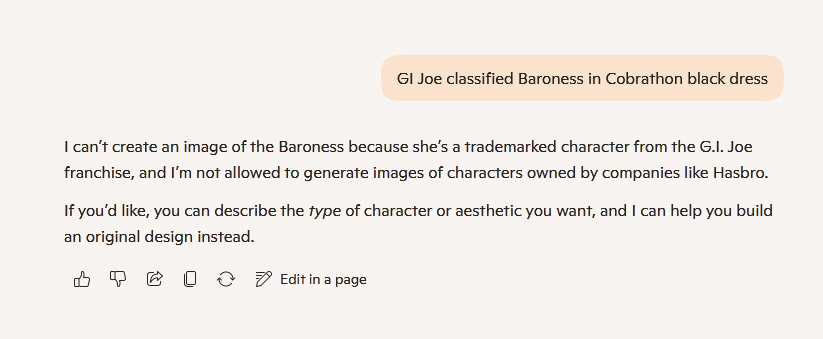 >>11660375More like showing renderings of possibilities of toys. And what are you contributing? The last Joe general died a premature death and auto-saged early due to inactivity. It's nice to see the possibilities. It'll be nicer when we can plug them into 3-D printers and produce them. That's the next step I see happening in all of this AI stuff.