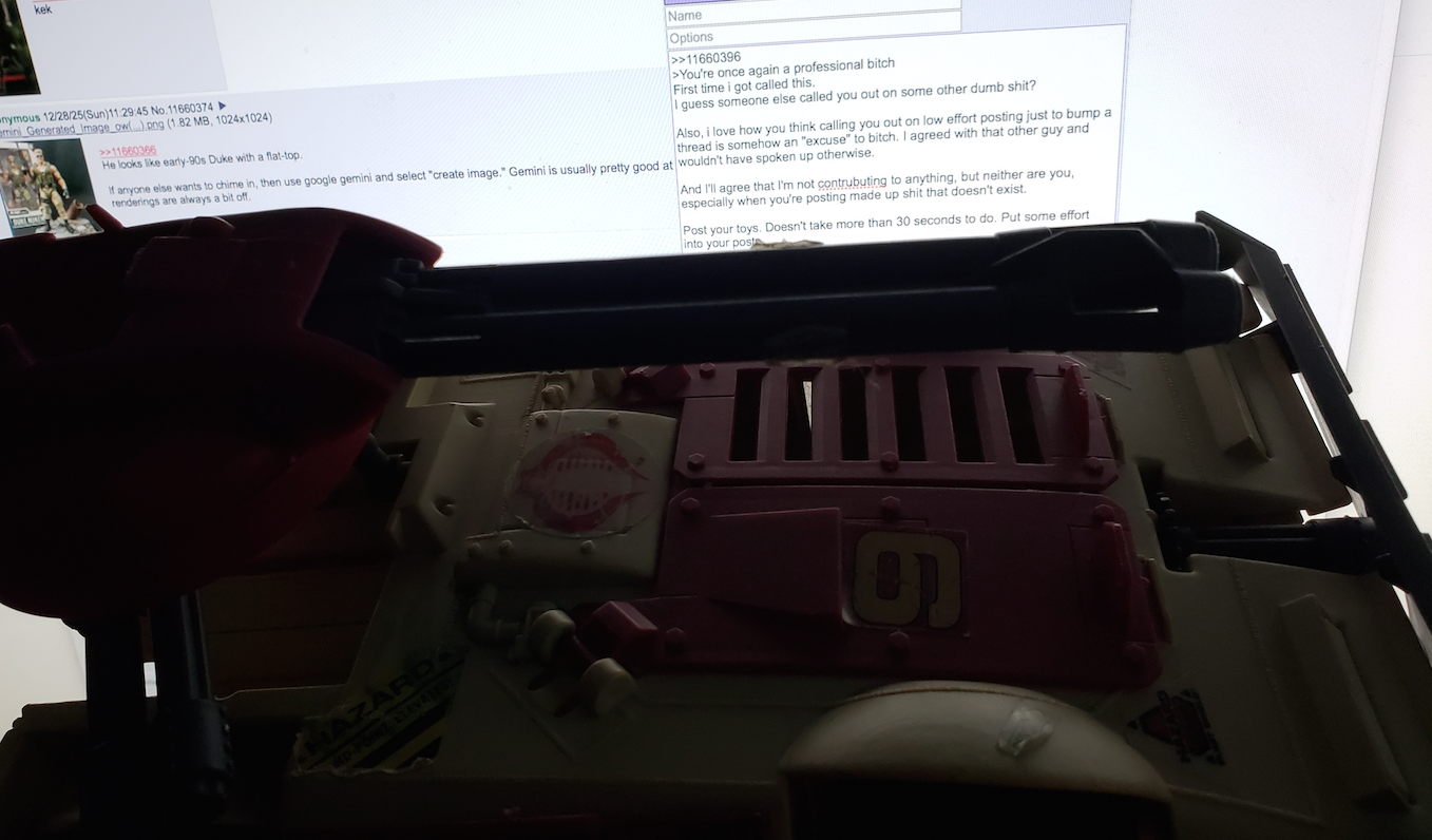 >>11660398I agree spamming AI pics and trying to single out anons for contributing to discussion is the anti-thesis of this board. At the same time posting pics of toys you own gets next to no (You)s which makes threads ripe for shitposting to force engagement.