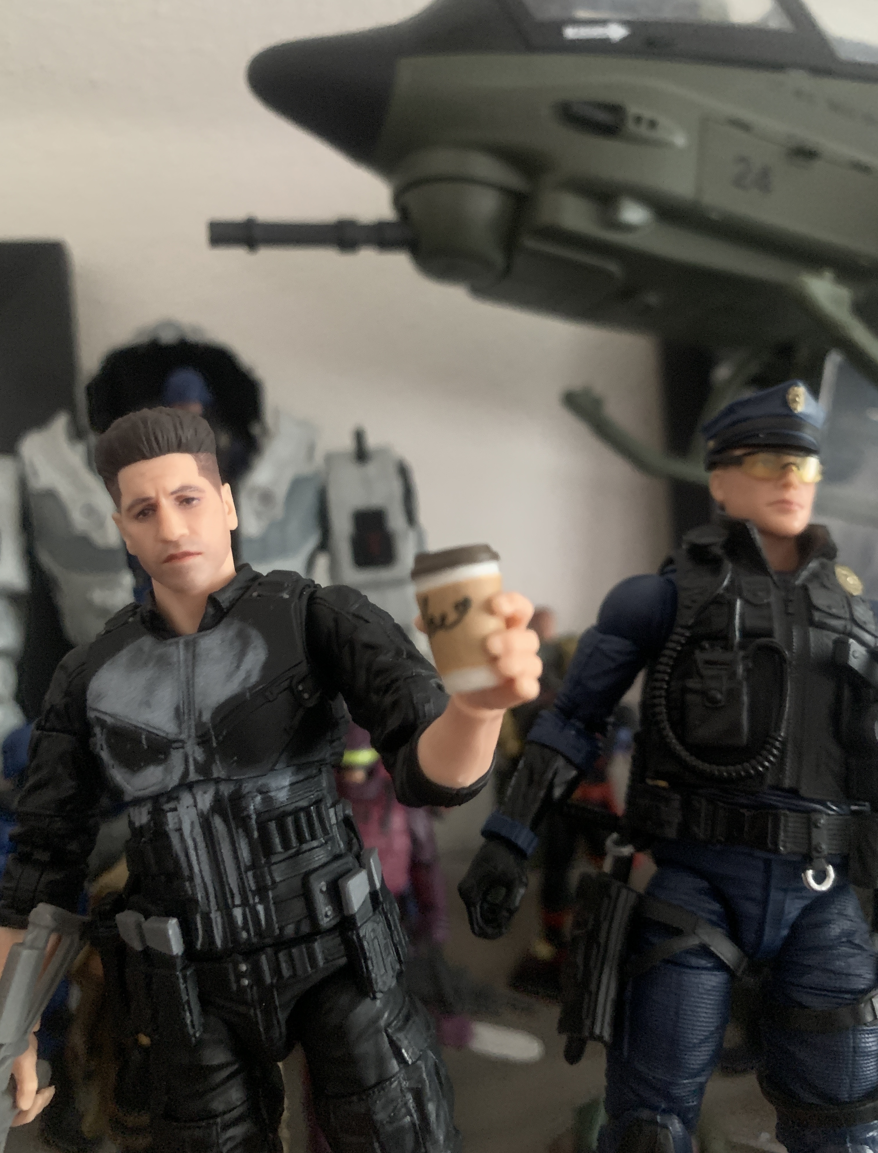 Marvel Legends Punisher can hold the Police Coffee, without stretching the hound out.
