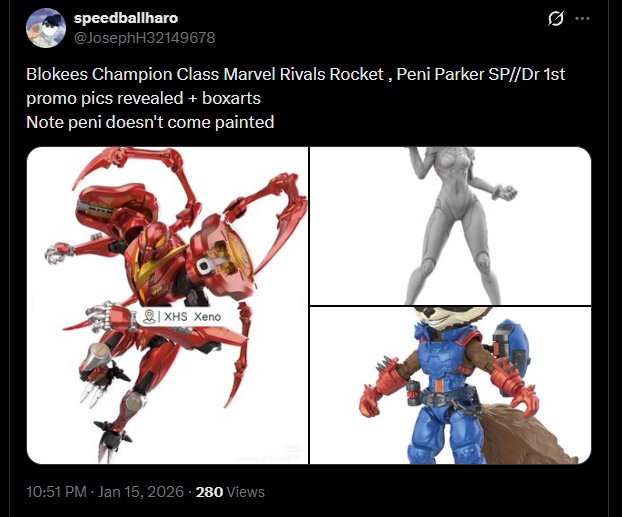 >>11657097>Hasbro ain't making any Marvel Rivals figuresThe leaked list shows them making some. Probably early 2026. It was mostly boring picsk like Punisher, Magneto, Iron Man, Venom, Jeff though. The only woman was Luna but they are locking her in a two pack with Spider Man I think it was.
