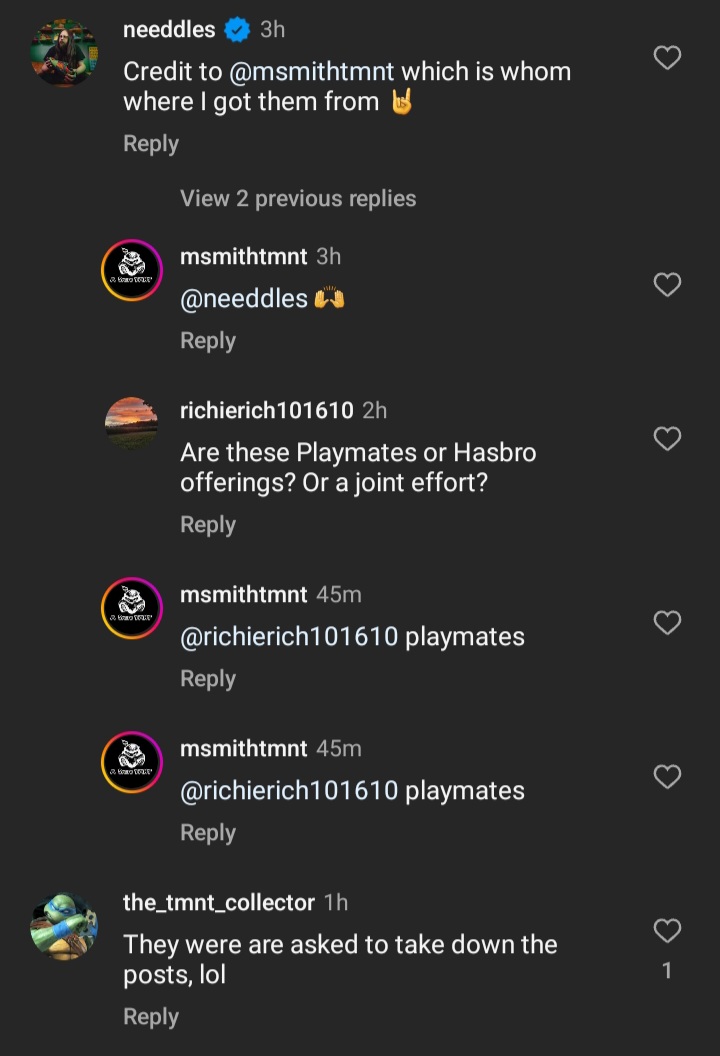 >>11666617>>11666622A confirmed leaker Msmithtmnt who has a solid track record is in the comments credited as the source. Apparently either Playmates or Hasbro is contacting people to take down the leaked images. These are legit leaks. Get hype!