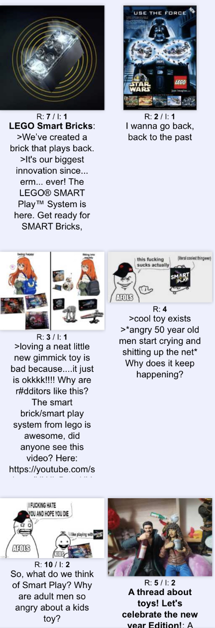>>11670507Nah It's possible the brick requires an app to update the sounds but I'd hardly call it data hungry. Do you know the kind of shit storm Facebook moms would stir up if someone leaked that the lego app was stealing data? They'd call it part of the democrat conspiracy to make the kids gay transgender furries. And the brick fundamentally isn't "replacing" anything. Traditional sets will still make up the majority of releases. The technology it's is cost prohibitive. They're not going to pivot into being a tech services company for shits and gigs. Call me a shill all you want but it's astonishing the leaps in logic many channers are making in an effort to shit on a gimmick that's phase put in a few years like every other gimmick before it.