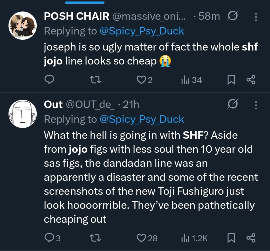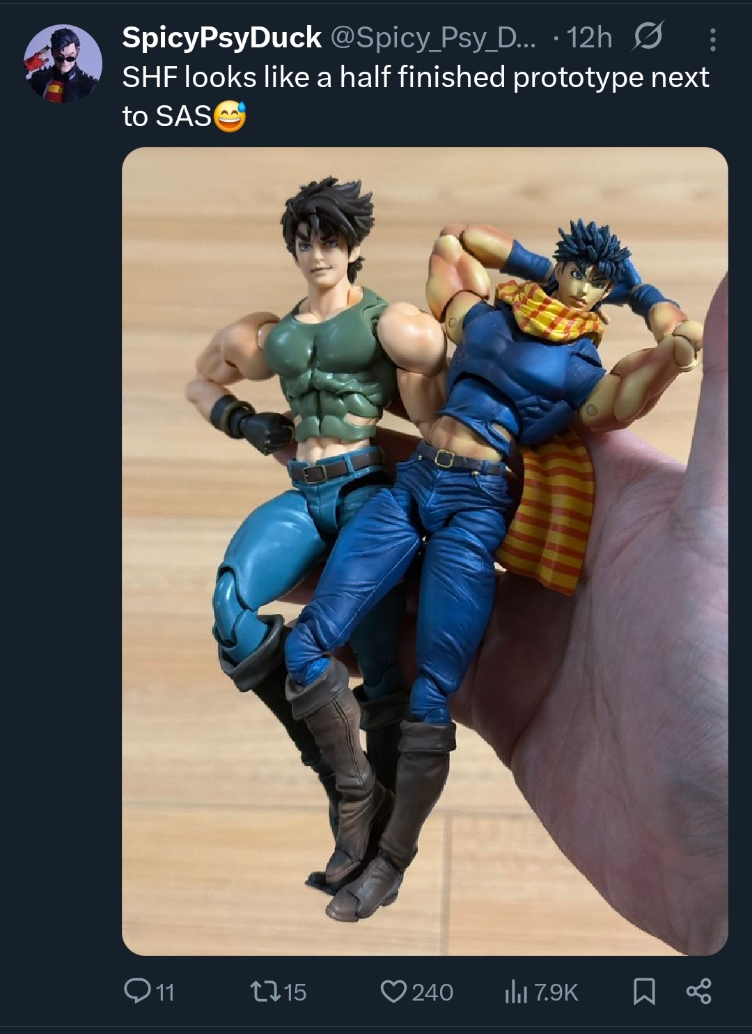 >>11678831Hear hear. I'm envious that you got the exclusive Josephs, but I have to be honest, I've never quite liked SAS Joseph. It just doesn't look like the Joseph I like. I am happy about the hammer and crossbow that comes with him, but that's about it.The SHF is closer to the anime design and that's the one I'm fonder of. Plus it comes with good faces (even if I wish there were more), and a removable scarf without the hole situation.Not sure if I will get the rest of the Jojos as I don't feel as strongly about manga design vs anime design for them, but I might. I've liked Jolyne's base anime colorway far more than the first two SAS versions we got, and if the SHF Jolyne ends up with good accessories that sell her stand effect, then I'll be happy to get her.And if you got Jonathan as well, you now have hamon effects that work with both. Plus you can probably find ways to add it to their sword/clackers too.