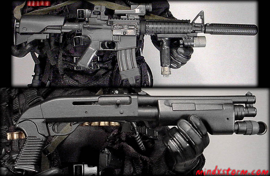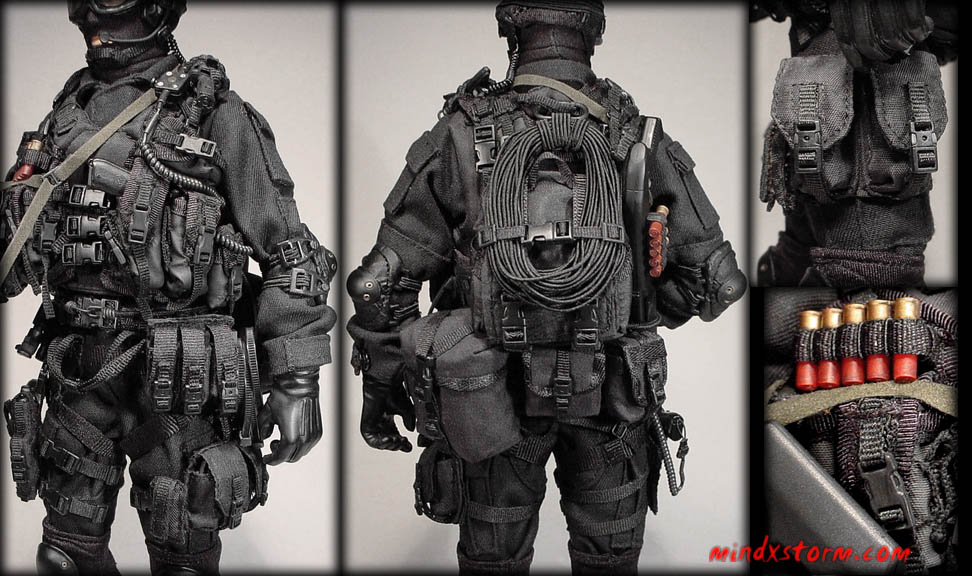 Radio Headset: Custom made using misc. black nylon, elastic webbing, black bbi buttons and Fabri-Tac. The boom mic is made from an electric guitar string painted black. The mic diaphragm is hole punched from a plastic DML Navy SEAL gloved hand. A small hole was made in it to attach onto the mic boom. Then it was also painted black with flat acrylic paint. The small-coiled wire coming from the headsets earphone is a piece of 28-gauge PVC coated solid core wire. It was coiled into shape by winding the wire around a thin and straighten out paper clip. The bbi push switch's button was painted OD. Between the push switch and radio is a piece of 26-gauge solid core/PVC wire. The wire attachments are all made with miniature sections of heat shrink tubing. The DML Motorola Radio is located in a small vest pouch on the left side of the LBV. The horizontal pouch was removed from the upper right of the vest and secured to the open loops on the vest under the left arm.BDU's: bbi EF SWAT Team "Barret". The chest pockets were relocated to the upper arms and the shirt is tucked into the pants. Not seen is a narrow elastic belt to hold the pants tight. Also, the pants have belt loops that worked nice for this purpose.Body Armor: bbi Night Ops SEAL armor vest modified by removing one of the Velcro waist panels for a more streamed lined fit. Also the silver hardware on the shoulder straps was painted black.SOE CQB Vest: bbi Green Beret's "Eagle/Rogue" modified by painting the OD nylon fabric black with acrylic paint. Replaced the fastex buckles on the front and upper rear with DKY upgrade buckles that have a bit more streamed line look. Added two tri-glide buckles to the shoulder adjustment straps in front. Also added extra bbi black webbing and buttons for holding the knife under the left shoulder's utility loops.