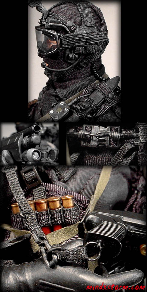 12-inch Figure: DML Ranger Larry Nash.Three Hole Balaclava: Custom Made from black stretch fabric.Tactical Goggles: From 21st Century Toys Scud Hunter figure. Removed plastic buckle.Night Vision Binocular Rig: Modified from a pair of bbi Night Ops SEAL "Owl" NVG monocular. A second tube was added to the left side of the IR illuminator housing. Please click here to see my NVG tutorial: Modifying The bbi NVG Monocular