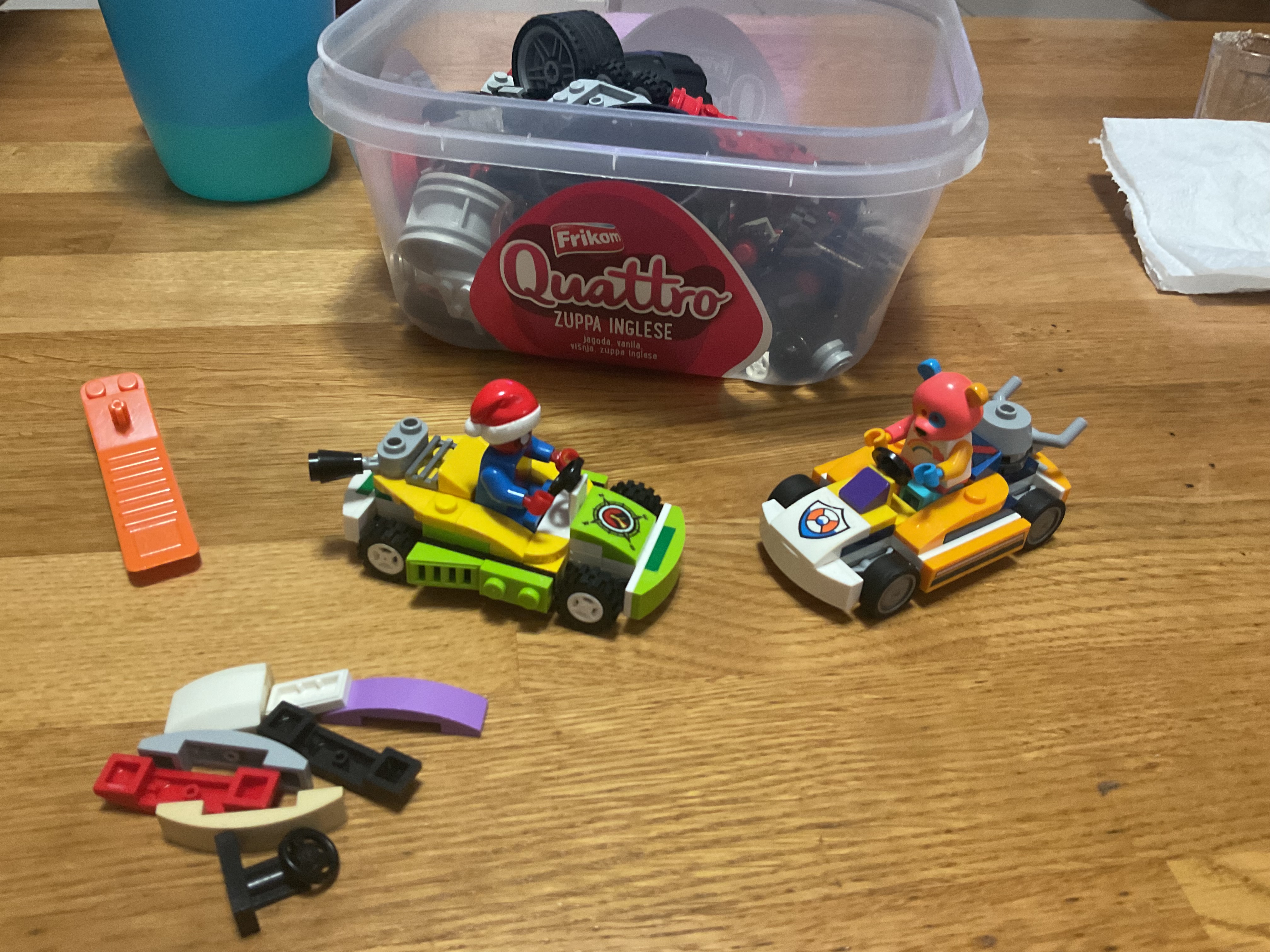 I had enough bits in my collection to finish the go cart I found by the trash bin yesterday. Then of course I had to make another. Why should gay bear have all the fun?