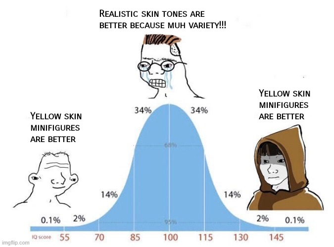 >>11690865The low IQ opinion is that yellow skin tone makes all parts compatible, while the enlightened opinion is that yellow skin tone mostly eliminates race politics from LEGO, like that BM/WF combo found in the recent Mandalorian battle pack. I like all my Mandalorians to have black, featureless heads.