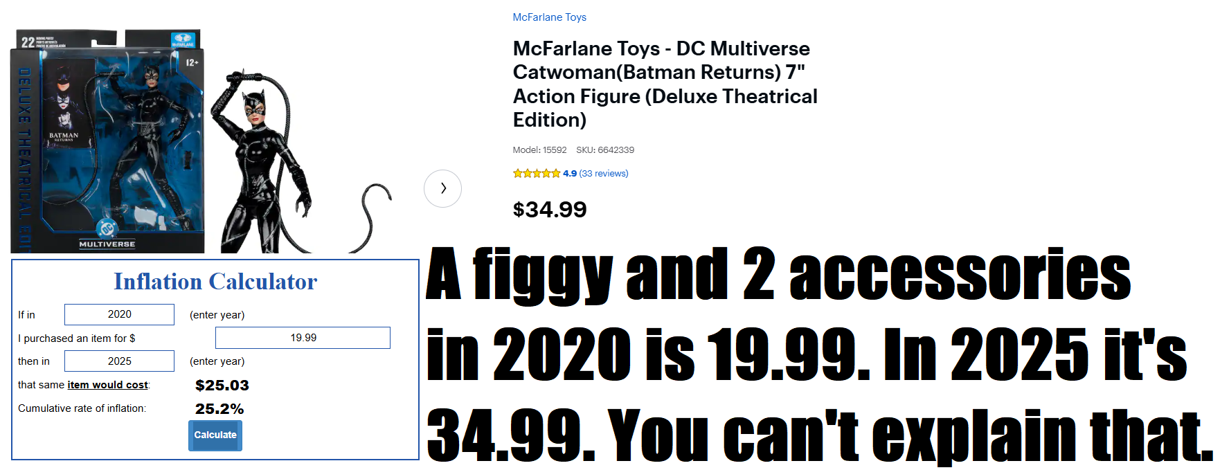 >>11688202You can easily explain this as hyperinflation and that literally everything else is markedly more expensive than it was six years ago. Yes, the price of toys is outpacing actual inflation, but it's still the direct cause. Why are you guys so dumb?