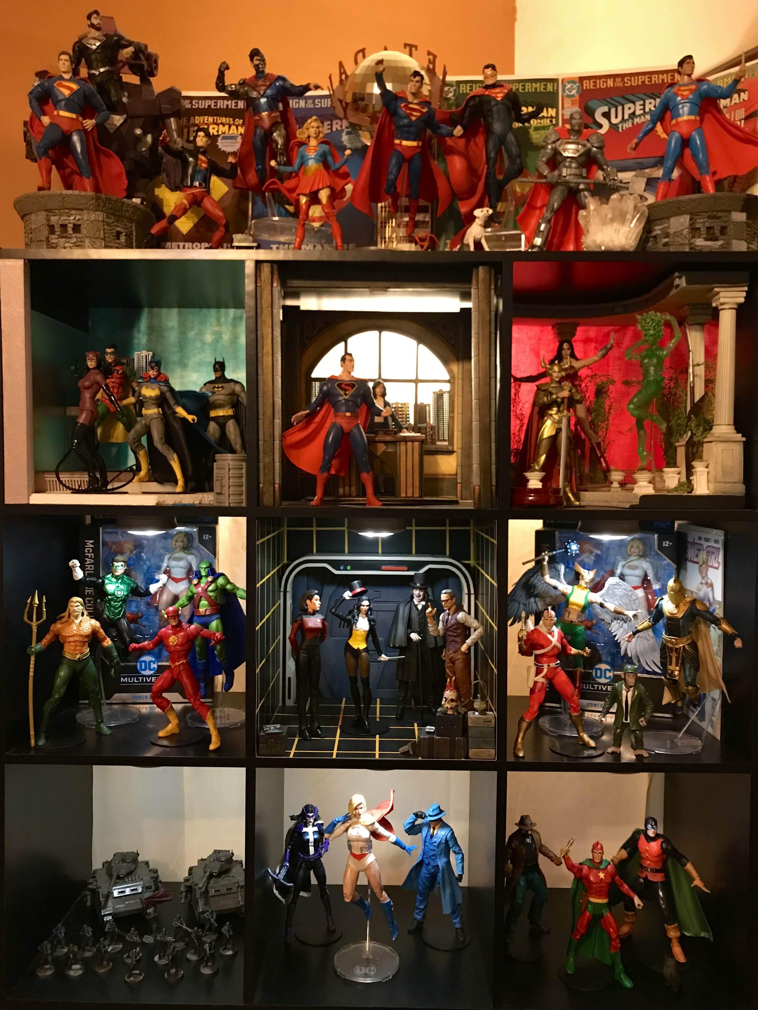 >>11688929>1 actual toy picture: last 4 hoursAnd you contribute nothing.I'm still waiting for Starman Jack and Ice. I moved the villains into another shelf with all my Watchmen and Kingdom Come figures. Right now I'm painting some Helghast I printed for either Spectre Operations or 40k but I'll probably put Fire, Ice, and Zatanna in that bottom left corner. The Star Trek holodeck is cool but doesn't fit the theme and Nacelle is taking forever to come out with their figures, so I might make a dedicated Trek shelf and move everything there, and bump Power Girl, Huntress, and Question up to the middle, and put all the Starman stuff where they are now. Oh and I need to finish the Gotham shelf diorama, but I don't really give a shit about Batman and he's only that high out of respect.I'd be open to picking up a Green Arrow, maybe that Injustice one.