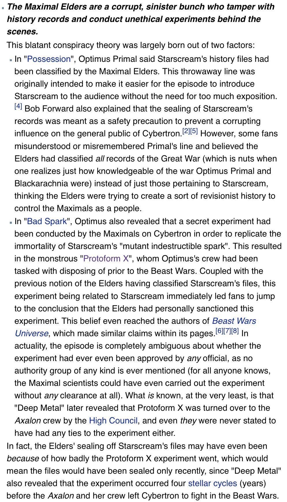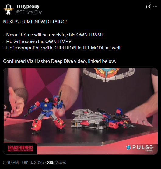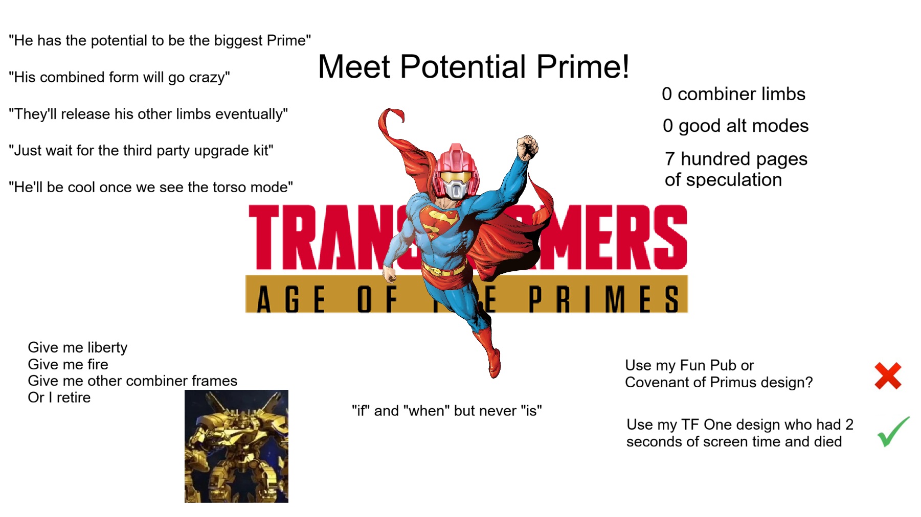 >>11695236Add on top of this most of the 13 Primes are borrowed shit they are working backwards with. The now infamous Aligned Continuity started this 13 Prime meme, that was 2010. They borrowed the Vector Prime from the 2004, Fallen from 2002, Liege Maximo from 1994 and Alpha Trion from 1984. Others for sure but those four are showing how much a fanfic monstrosity the whole idea was and the only reason it even holds any weight in the fandom is because of how low bar quality the whole production was (ie 30 minute/page toy commercial) >>11695298He might not have by pure technicality. AT didn't start as part of this 13 Primes shit. By your logic he wouldn't know Optimus Prime either. If anything is shows just how inside track this 13 Prime thing is even.