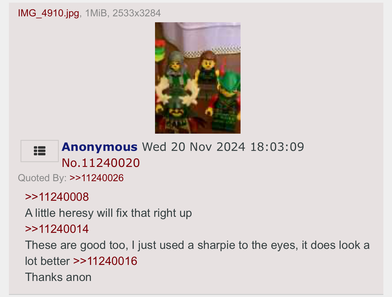 >>11696221>acquire sharpie >fill in white dot on the new minifigure eyes>80% of soul restoredIt still doesn’t compare to the old face but it definitely improved the art style