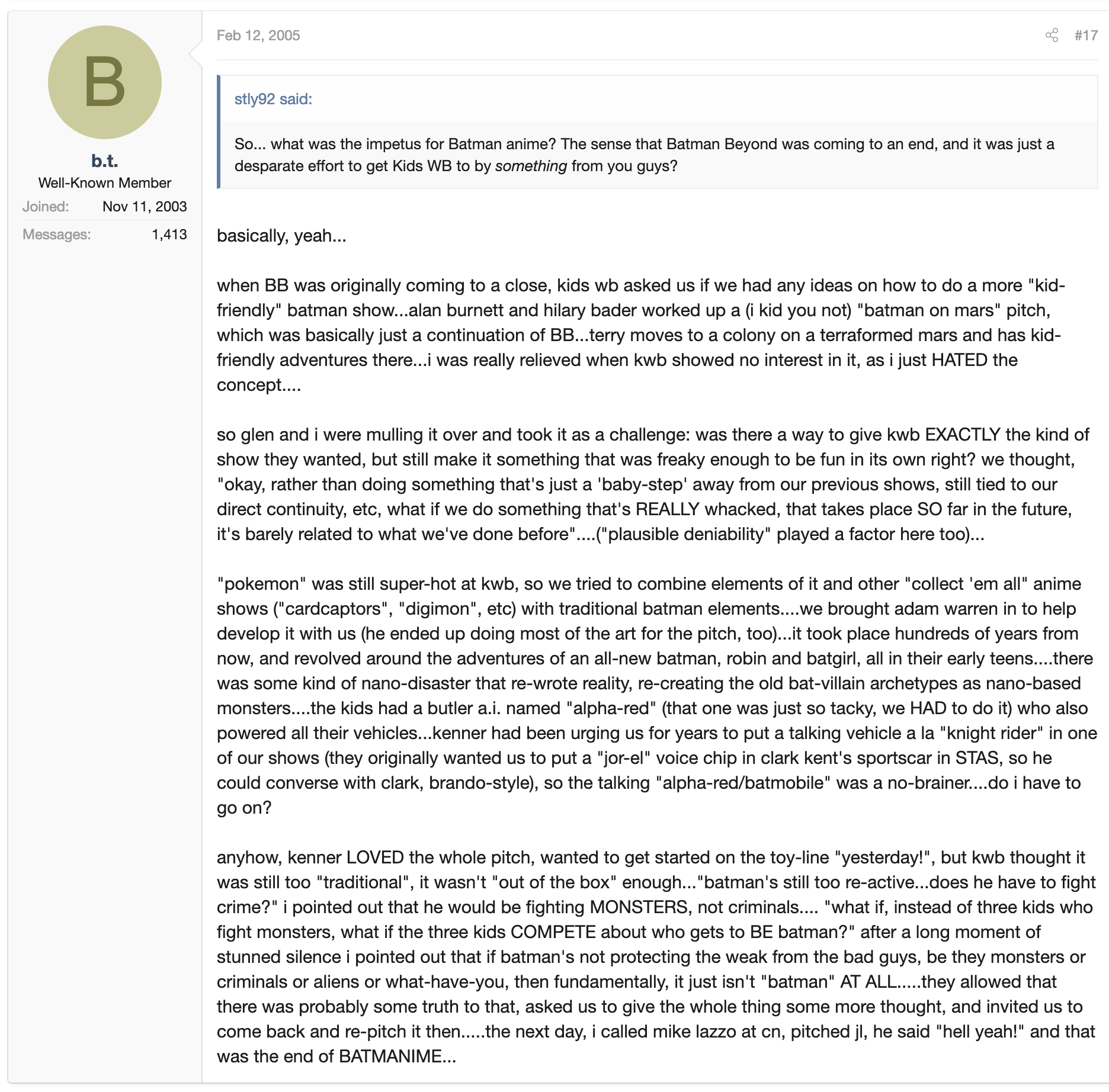 >>11695922>>11695927>>11695990>>11696009>>11696014>>11696119>>11696173from my recollection a lot of the Beyond figures were originally intended for a version of the Batlink concept that was going to be its own thing(that in turn was loosely based off a comic DC had published around the time involving Batman and Joker in cyberspace that was done mostly with CGI art) but with Beyond becoming a thing they needed a toyline for that fast so they just tweaked the concepts they already had ready and turned it into the Batman Beyond linecourse the whole story of how Batman Beyond even ended up happening is a whole clusterfuck of its own, as related in the attached image
