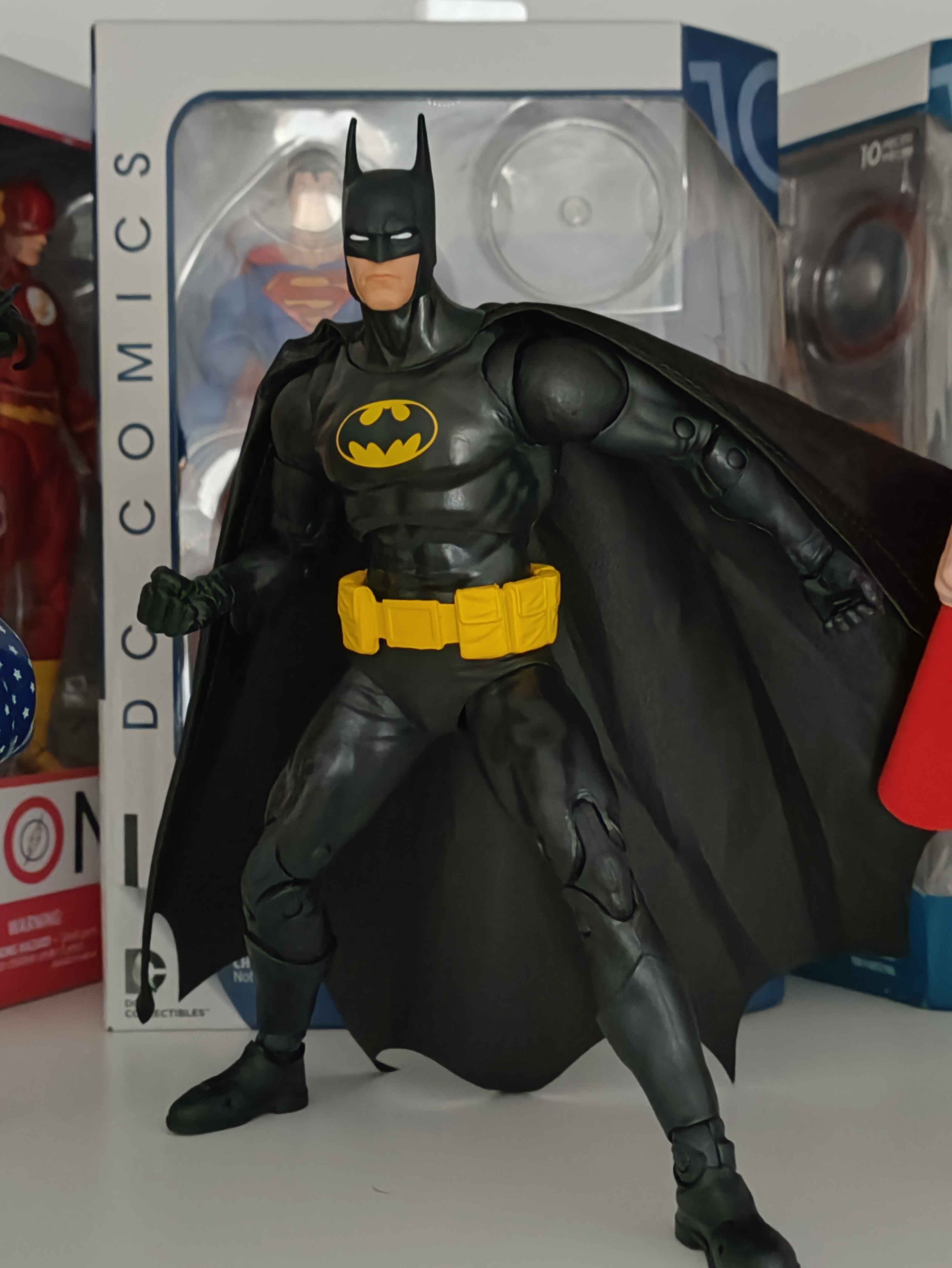Opened Bats yesterday and I like him so much more than the black and yellow 3-Jokers Batman. Way easier to pose due to the fabric cape and the proportions are a thousand times better, plus the head is almost perfect. Surprised about the symbol not looking too big in person. And the entire costume is actually black instead of having dark purple parts like the 3-Jokers BatsWill say that I wish the cape were wired but there's always something with Todd