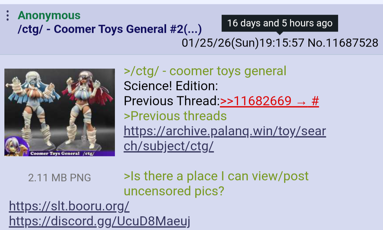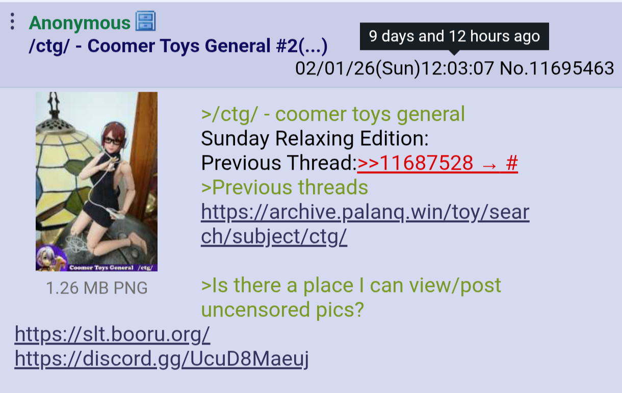 >/ctg/ - coomer toys generalRedo of Ayanami Edition:Previous Thread:>>11701519>Previous threadshttps://archive.palanq.win/toy/search/subject/ctg/>Is there a place I can view/post uncensored pics?https://slt.booru.org/https://discord.gg/UcuD8Maeuj>The Rules:Please censor ALL nipples/genitals before posting imagesDon’t kink shame, if it’s not for you, move onNo hotglue pics, it violates the board rules and that is not what we are here forIgnore obvious trolls, give them no attentionAll AI generated pics are considered off topic. Post only pics of toys or official concept art toy used to create toysBe respectful, have fun and most importantly post pics!>/ctg/ Approved figures, bodies, and accessories and where to buy/find them!https://raw.githubusercontent.com/ctgxxx/ctg/main/readme.txt