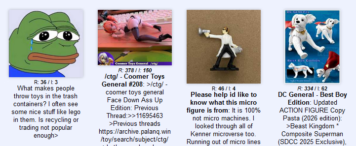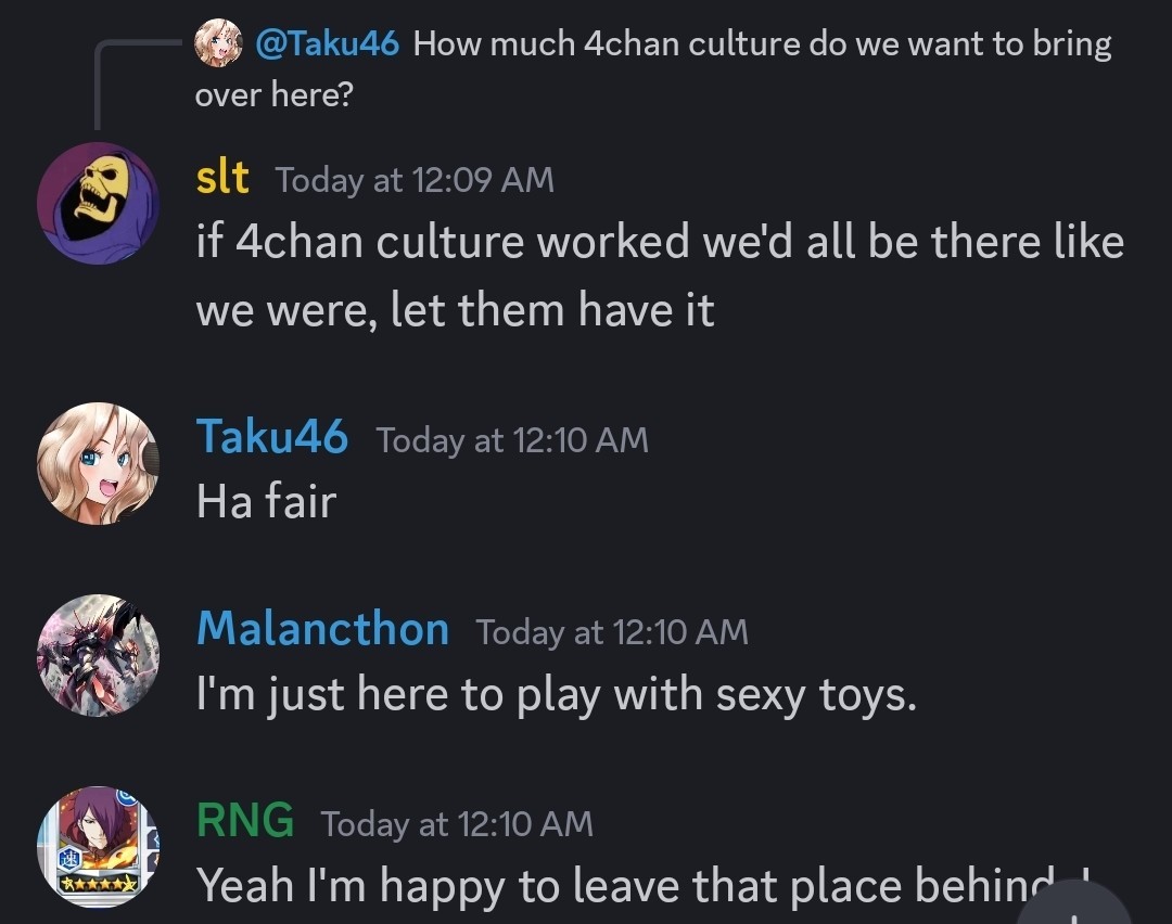 >>11704936Despite the similarity in topic there is a distinct difference in how talking occurs on each platform. Discord can be more freeing and NSFW but at the same time discussions can slant to more personal and off topic as the conversations flow for a little while although there are categories of discussion some times it can be a catch all for other toy topics that aren't necessarily /ctg/.Here the conversations usually stay a bit more toy focused and /ctg/ oriented through out however the conversations often are more sterile and frankly slant a bit overtly hostile.There are pros and cons to each. It's not an us versus them mentality each was set up by the same guy and have plenty of the same people. The only true full leg up discord has other than being able to be NSFW is that trolls can't interfere there because they would quickly be kicked to the curb.edit: one thing really noticeable pro for discord is that i don't have to take multiple attempts on this shitty ass captcha just to post a few thoughts. Why is there 1 easy captcha for phones and 3 hard ones for PC?