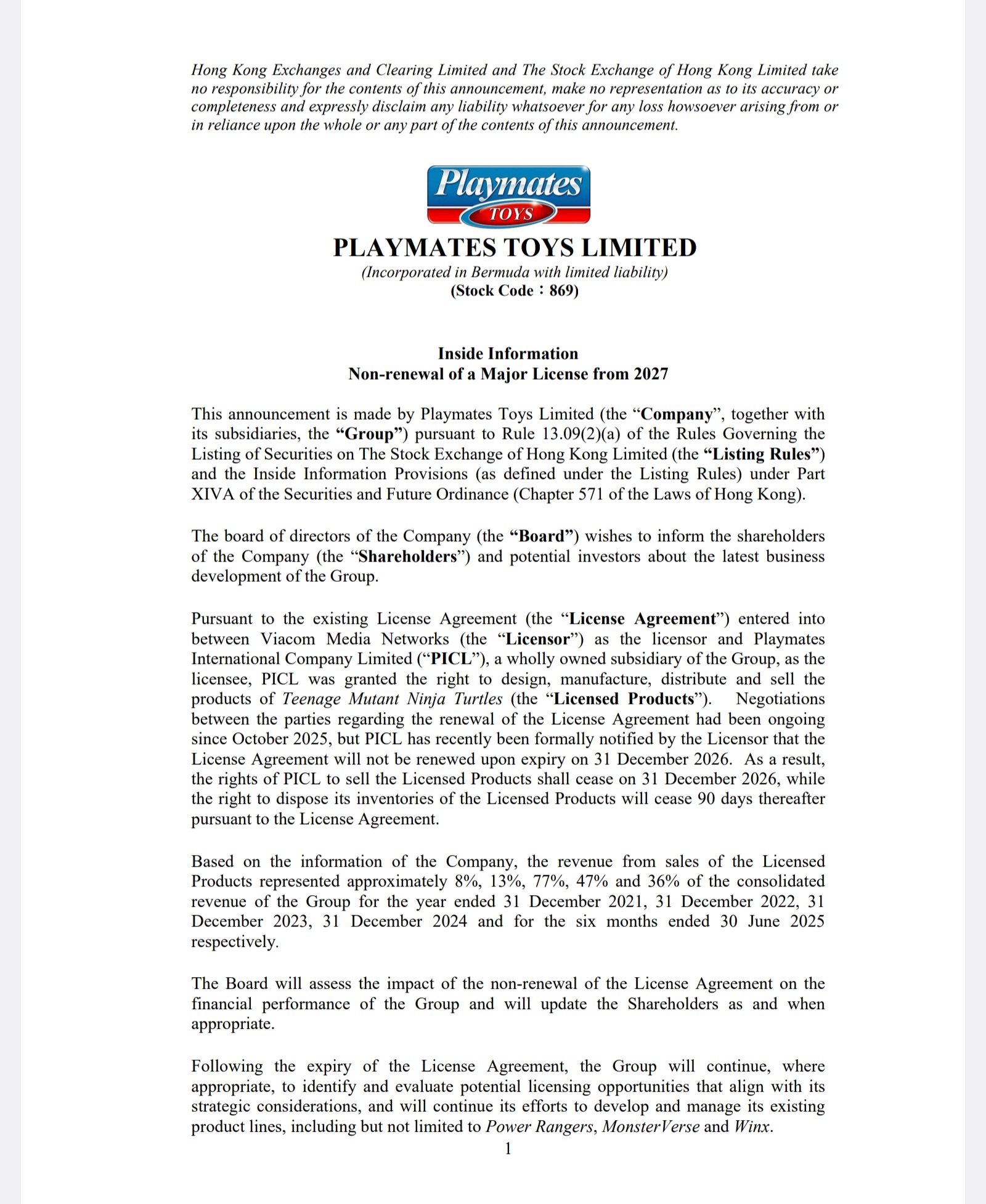 Thus, Playmates being formally notified by the Licensor that the License Agreement will not be renewed upon expiry on 31 December 2026.