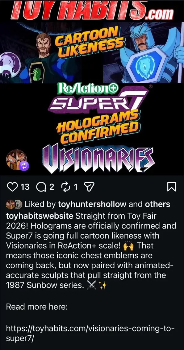 Toyhabbits confirmed with Super7 that Visionaries will have holograms like the vintage toys, but be based off the Sunbow character. We're getting steps and steps closer to a Hasbro shared universe O-ring figures. Would be neat if they also brought back Inhumanoids.