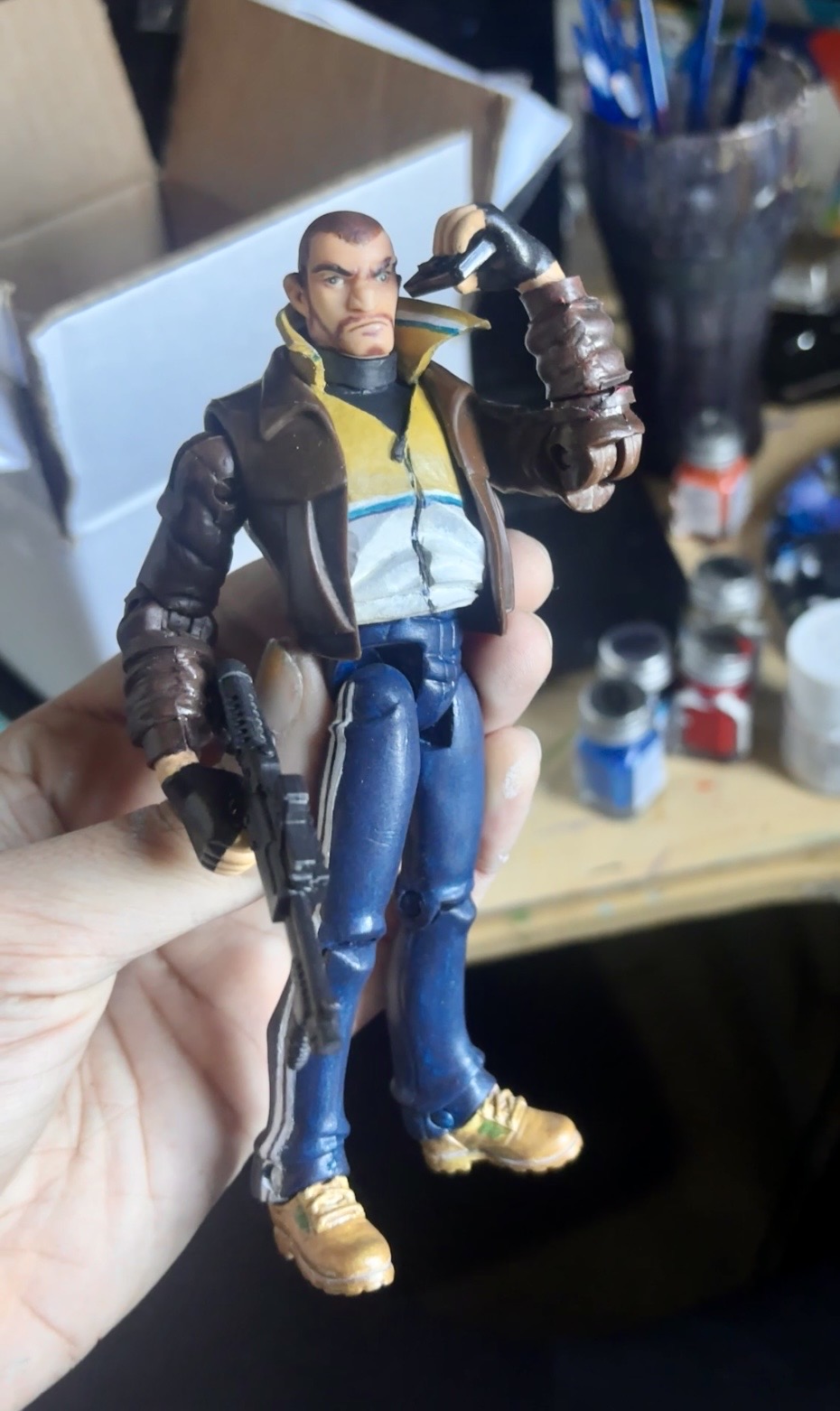 >>11732995>>11733027Thanks.As for my color matching method, I have some empty paint pots I bought at Hobby Lobby some years back and I mixed it up all as one color. I started with some Vallejo flesh tone then added white, pink and orange kept mixing, testing it on the neck peck and holding up up under my ott light until I got the color to blend convincingly. I ended up needing more orange than I expected but the end result was a good match.Today I'm going to paint the camo on his desert eagle holster and hopefully I'll have some shoits of him with all his primary gear on. The main work after that is going to be attaching straps to his weapons. I'm also waiting on his M202 Flash from Gridiron. I bought a Japanese kit for one a while ago but even though it says 1/12 scale it was too small.