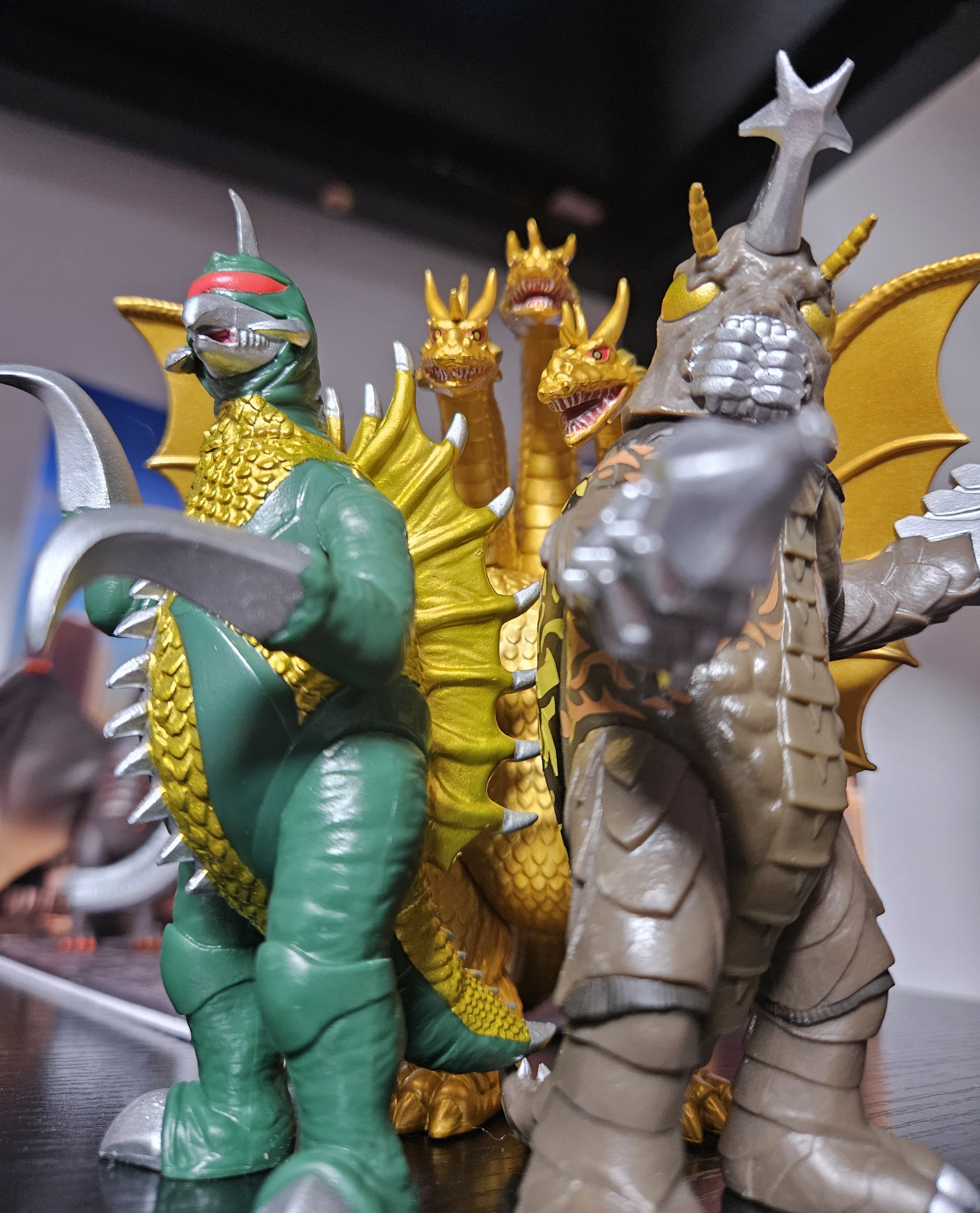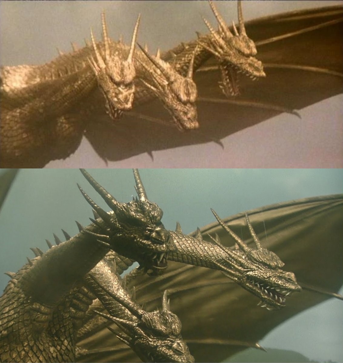 >>11728469Problem about Heisei King Ghidorah as a whole is no one actually knows what the actual suit color was. Some say it was bright gold, others say it was a darker gold, and then there's bronze gold. Think it's probably due to Godzilla vs King Ghidorah film quality differs with each release with some having filters, and some being poor quality. For this case, think Hiya based this new figures color on the recently shown prop heads at that one expo shown here (yeah they're basically completely rotted away.) which are more darker gold and possibly due to them being 35 years old and faded. Only thing I like about this new figure is the wings being more detailed than the original in paint while the older figure looks a bit too rubbery.