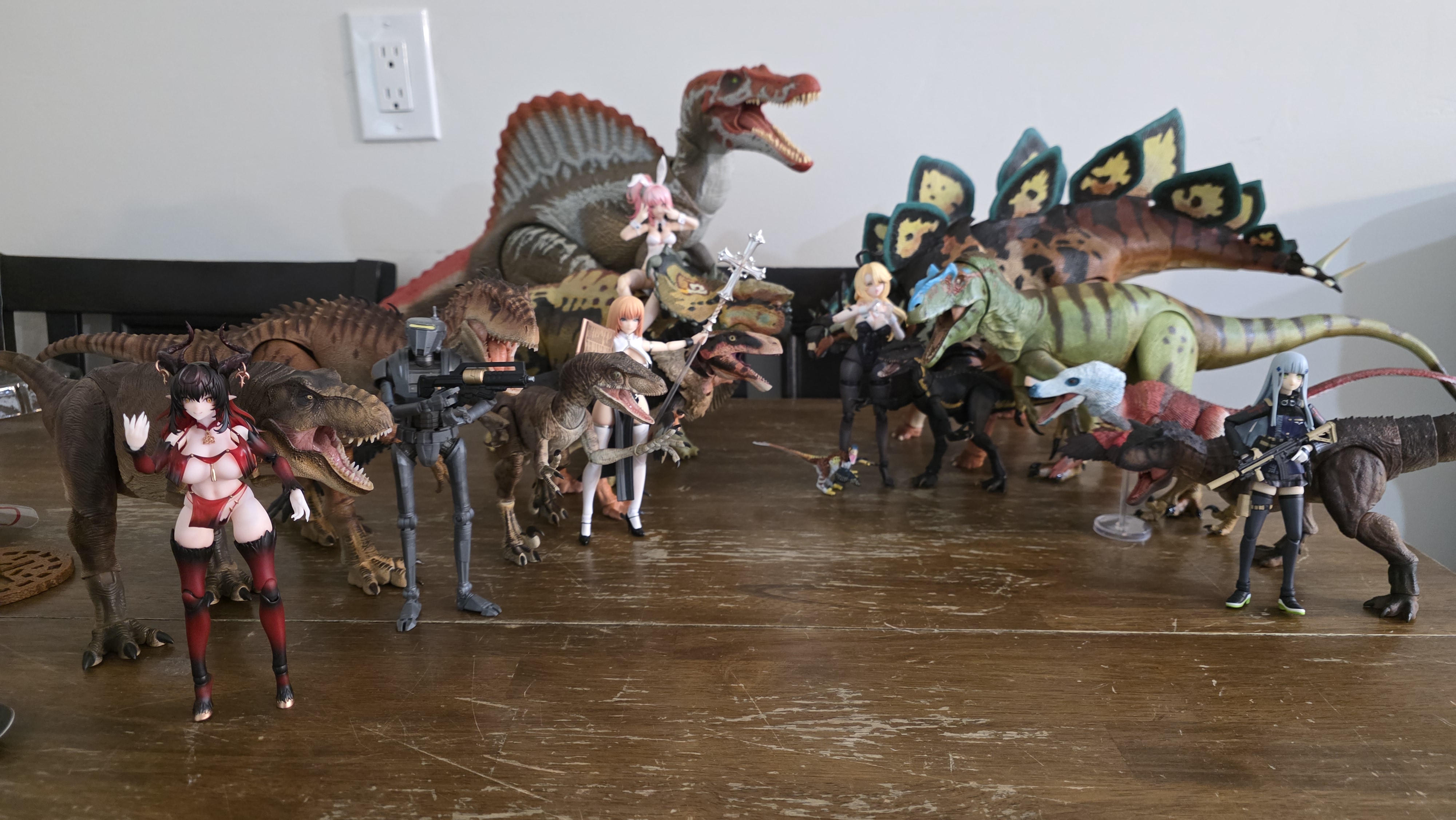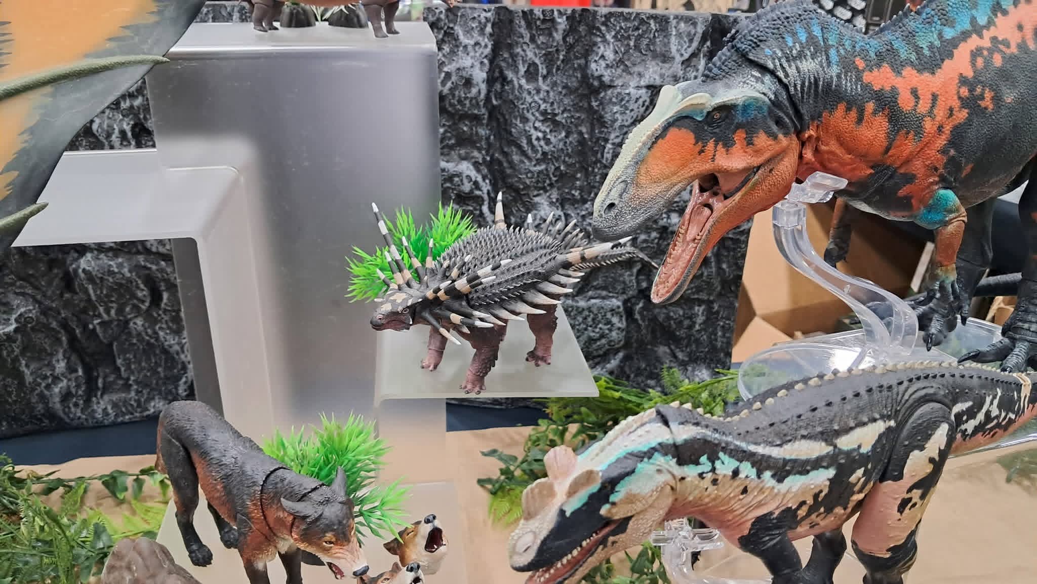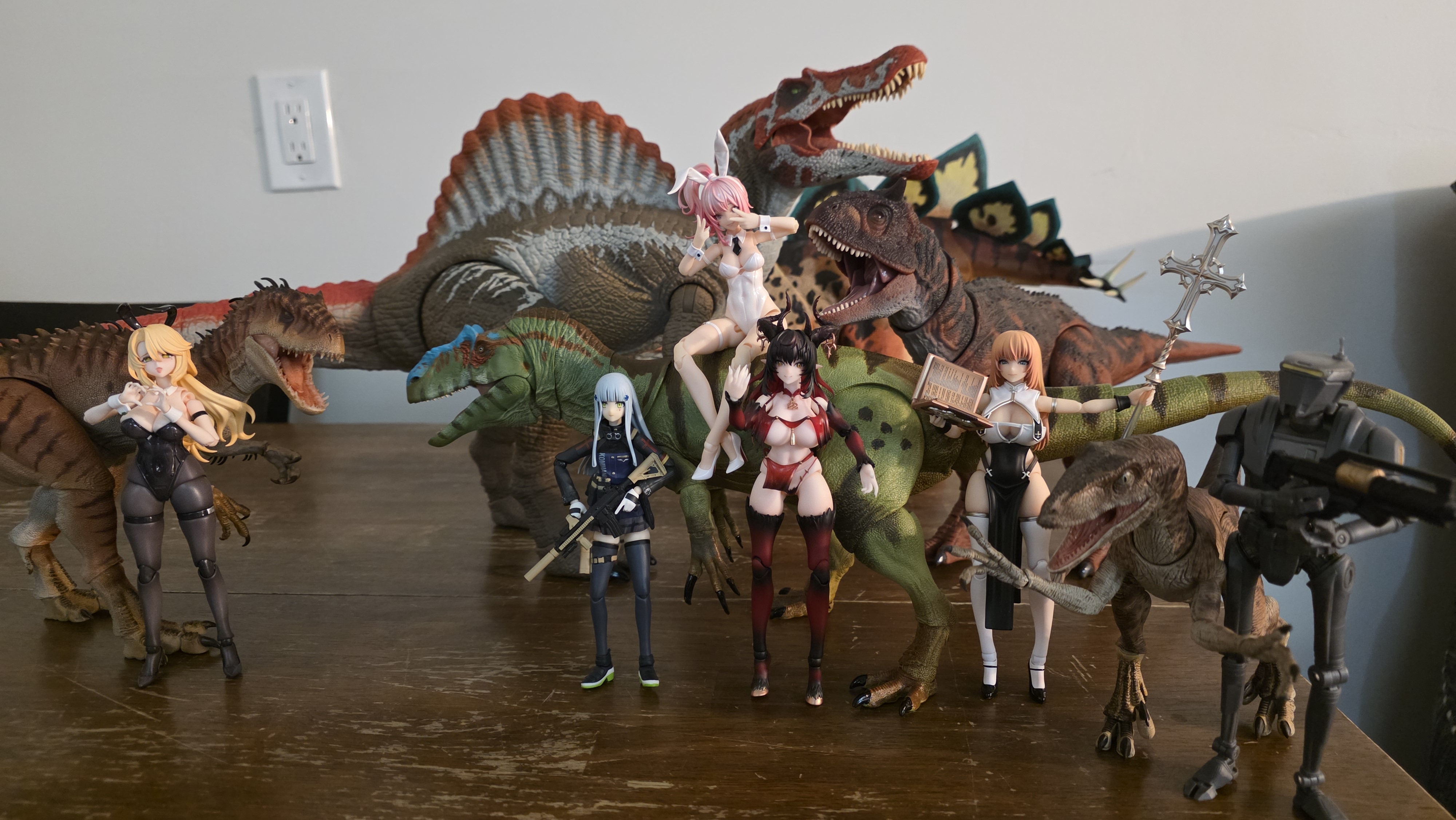 >>11748990The first wave of the Cyberzoic Dilo came out, but the factory accidentally under produced them so CB had to order a whole second wave to fufill the unfufilled orders. They should be shipping with this current wave>>11749778I dont collect 1/12 figures that arent robots or anime girls, so you'll have to forgive my limited points of reference, but here are some 1/35, 1/18, and 1/12 dinosaur figures. Nanmu does their large dinosaurs in 1/35 and their raptors in 1/12, the allosaurus you asked about here >>11750037 is one of their 1/35 scale figures and it is about the same size as the Carnotaurus behind HK416 (the blue haired girl with the gun). Most BotM figures like the achillobator, green allosaurus, Pachyrhinosaurus being ridden by the pink bunny girl, and the stegosaurus are 1/18 scale, but the blue, white, and red feathered velociraptor is 1/6 scale. The Nanmu JP Velociraptor by the nun is 1/12 scale. The Nanmu Indominus and Tyrannosaurus next to the Star Wars Black series robot and the succubus are 1/35 scale and could probably be used as mounts for most 1/12 human figures. The Hammond Collection like the Spinosaurus in the back is also 1/18 like BOTM, and while they are super cheap if you can get them in store they skyrocket in value on thw aftermarket because Mattel does not care about even distribution.
