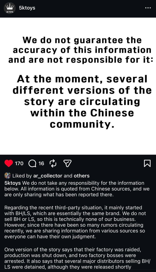 >>11740695You gotta think from bandai's prospectiveThey designed a new Goku and want to make a definitive brand symbol with itIt got leaked from a factory a month ahead and posted online and sold3P is already making pre making accessories for it before it's supposed to ship officiallyThen a few months after it comes out, one of the 3Ps not only clones it, but perfects it and with no warning shadow drops one of the most requested characters ever in such high quality that nobody would ever need a reason to buy bandai's version I'm sure they were already annoyed about 3P like how mafex is, but this gohan definitely hurt them more than any other 3P release, and they're using any opportunity to pounce such as black hole's numerous fuck ups