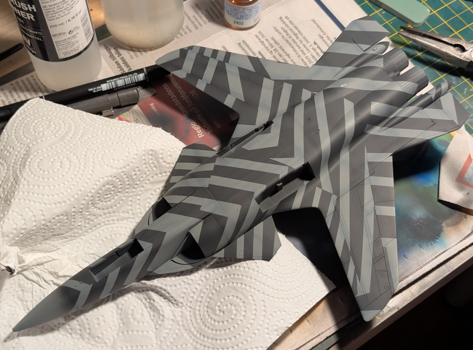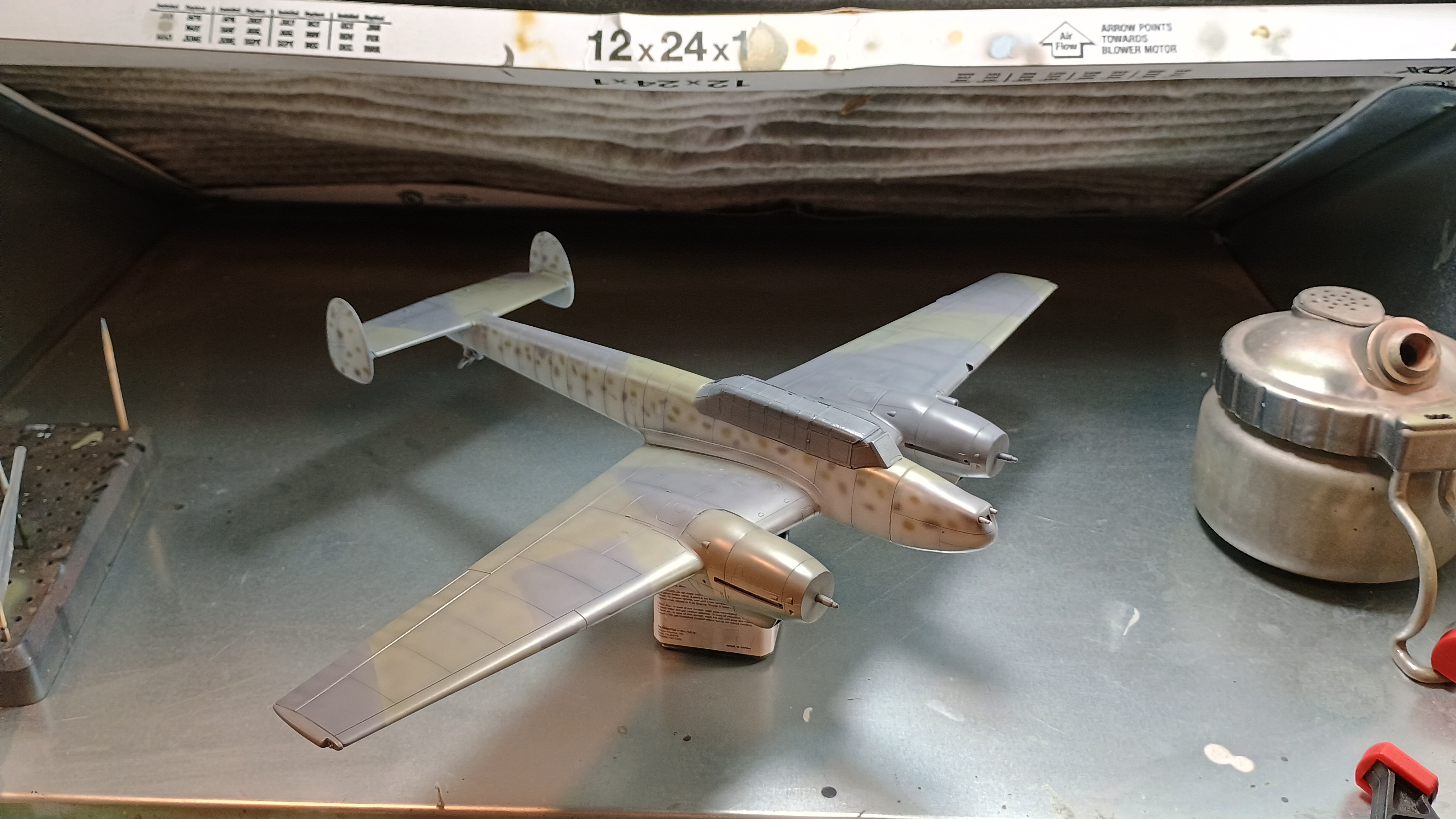 painted this thing twice, first time I wasn't happy with the colors I used, and this time I tried to mix my own green. again I'm not happy with it, but I see the photos next to each other and realize they're almost the same fucking shade anyways.i dont really want to repaint this thing for the 3rd time so I'll probably just carry on I guess. totally wrong colors but I dont have what it calls for (rlm74 and 75) and I've got a feeling my local shops won't have it either