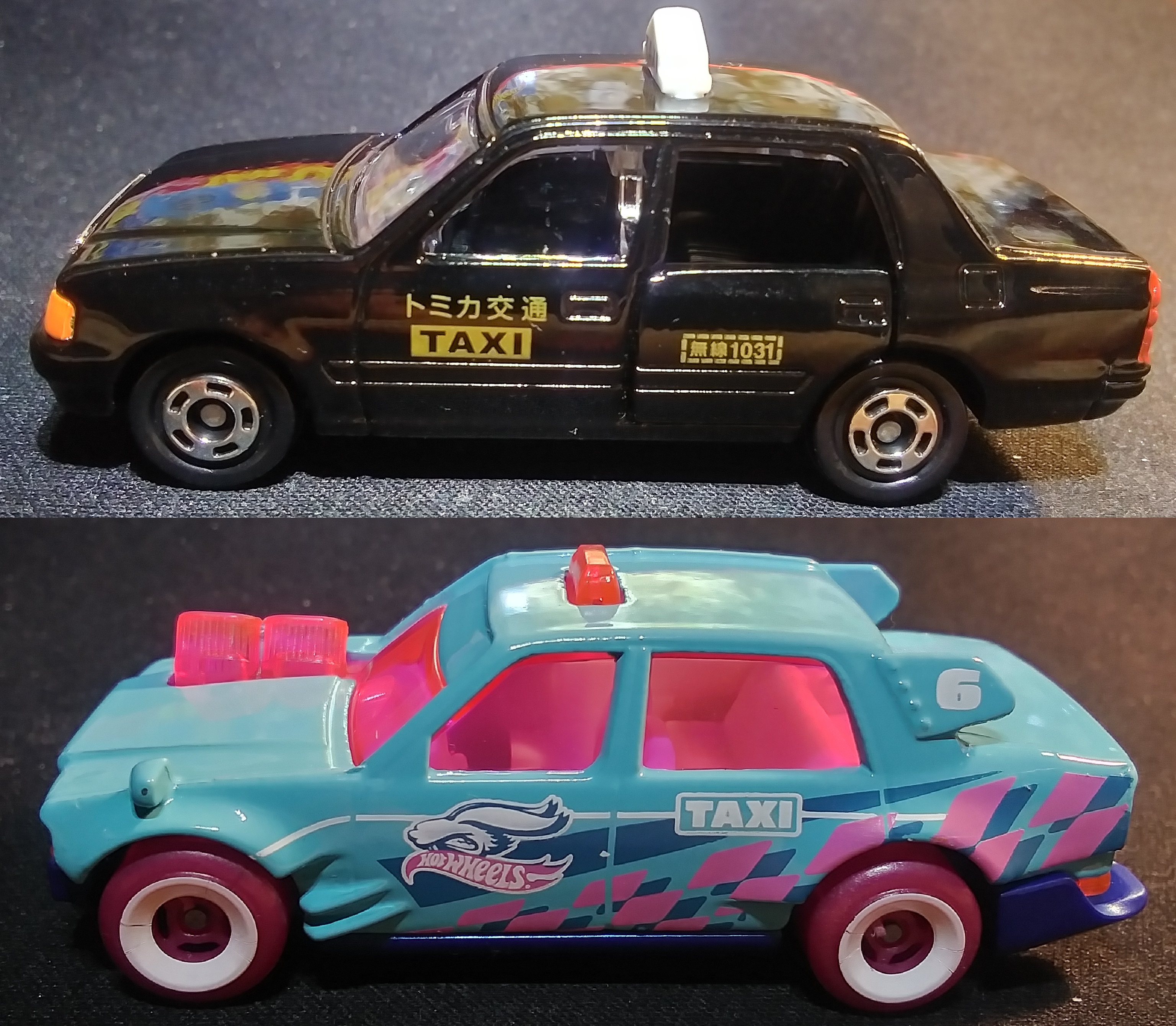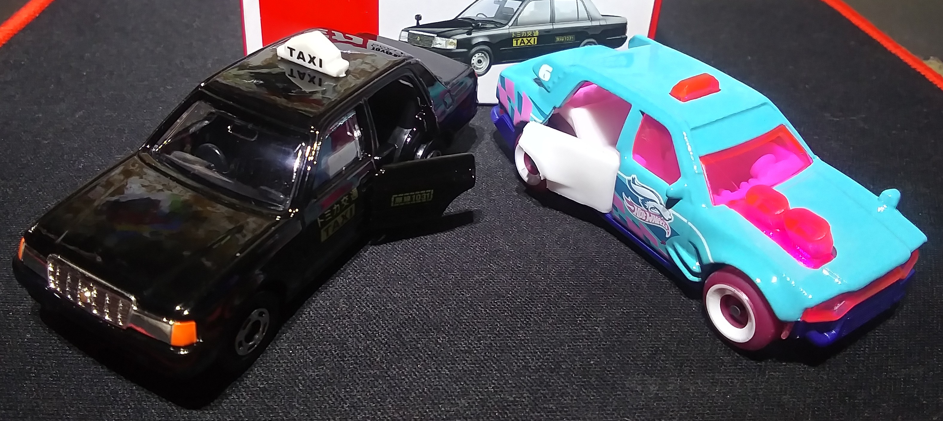 I have a single Tomica, a Toyota Crown Comfort Taxi with an opening door. The HW Time Attaxi was based on the the Crown Taxi and also has an opening door. This one was from the 2025 spring series so it has a garish pastel color scheme. I'm hoping they rerelease it in black to match the Tomica.