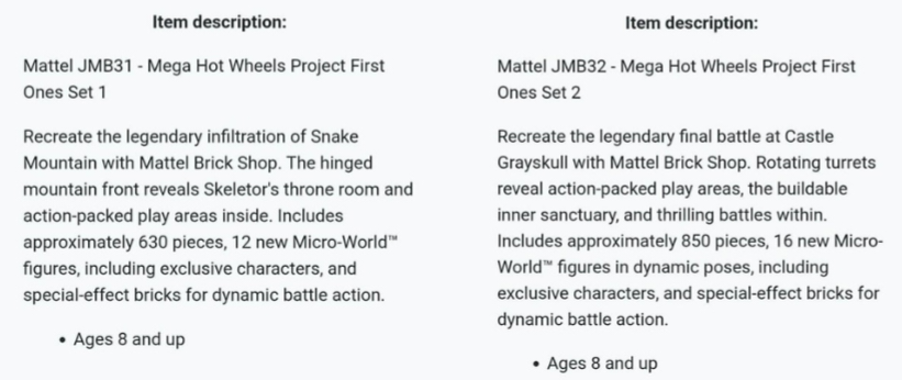>>11735153Some news regarding the MotU MBS sets:So, with the piece count compared to the figure count, I’m not sure if these “new micro world figures in dynamic poses” are actually articulated, or if they’re called dynamic simply because the poses vary from figure to figure even though each one is static.The Fright Fighter, though, is a helicopter, which gives it the highest chance of using the old micro action figure system. It’s much smaller compared to Castle Grayskull and Snake Mountain, which are full fortresses. Because of that, there are basically three possible outcomes.1. The “new micro world figures” is just a rebrand of the current micro action figure system. That would be the best case scenario. Maybe the Fright Fighter could carry that legacy even if the other two sets don’t, simply because of its smaller size.2. It’s an entirely new figure system. Whether it’s larger than the micro action figure system, or more or less articulated, remains to be seen.3. Worst case scenario, they standardize the 1x1 stud static figure system. You know, the 1x1 Cortana, Roland, Vault Boy, and Squid Game Pink Soldiers. I’m not against that system, but I’m hoping it won’t end up being a cop out that replaces the micro action figure system. Then again, all eyes are on the Fright Fighter… unless they somehow decide to include a 1x1 Skeletor figure with it, which would honestly be kind of laughable.Right now, the full lineup of Mattel Brick Shop Masters of the Universe movie sets seems to be:>Buildable Display Havoc Staff>Buildable Display Power Sword>Buildable Display Skeletor Bust>Castle Grayskull with micro world figures>Snake Mountain with micro world figures>Roton display set>Fright Fighter display set>Buildable Display Battle CatIt really feels like Mattel has given up on aiming these at kids. Mattel Brick Shop looks like it’s going to be geared more toward teens and adults instead.
