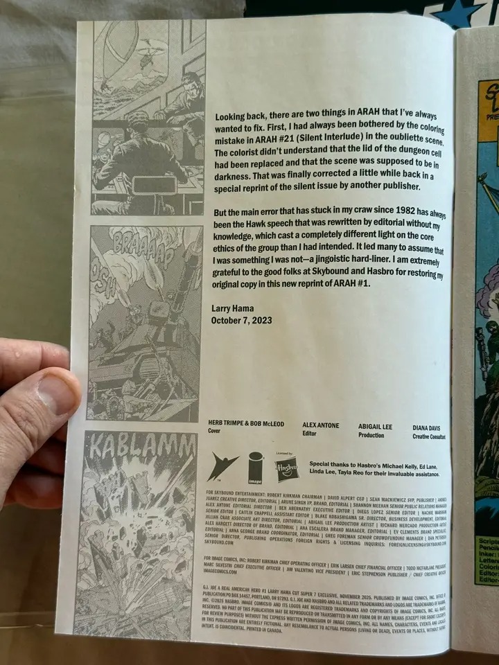 A forward by Larry Hama in the reprint stating that it restores some dialog that editors changed in the original printing.