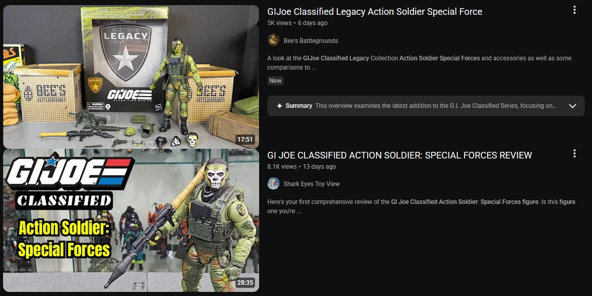 >>11749752There's room in the series for all of it from the cartoon stuff to the realistic to even the actual real-world stuff like realistic cops and marines. There's no "THE LINE MUST ONLY BE THIS ONE WAY THAT I LIKE" with Classified.And personally I enjoy it that way. So embrace the Zartan in yellow spandex pants!>>11749766Bush killed cartoons, bro. He passed that requirement that saturday mornings MUST be reserved for "educational programming," which is usually Black kids talking about marine life or some other shit. After that all you got left are Cartoon Network, Nickelodeon, and Discovery Family. Now cartoons are as niche-market as comic books are. >>11749955Retro CC is one of my favorites. I don't care that it ended up overproduced to become a Ross clearance item. It's still cool.