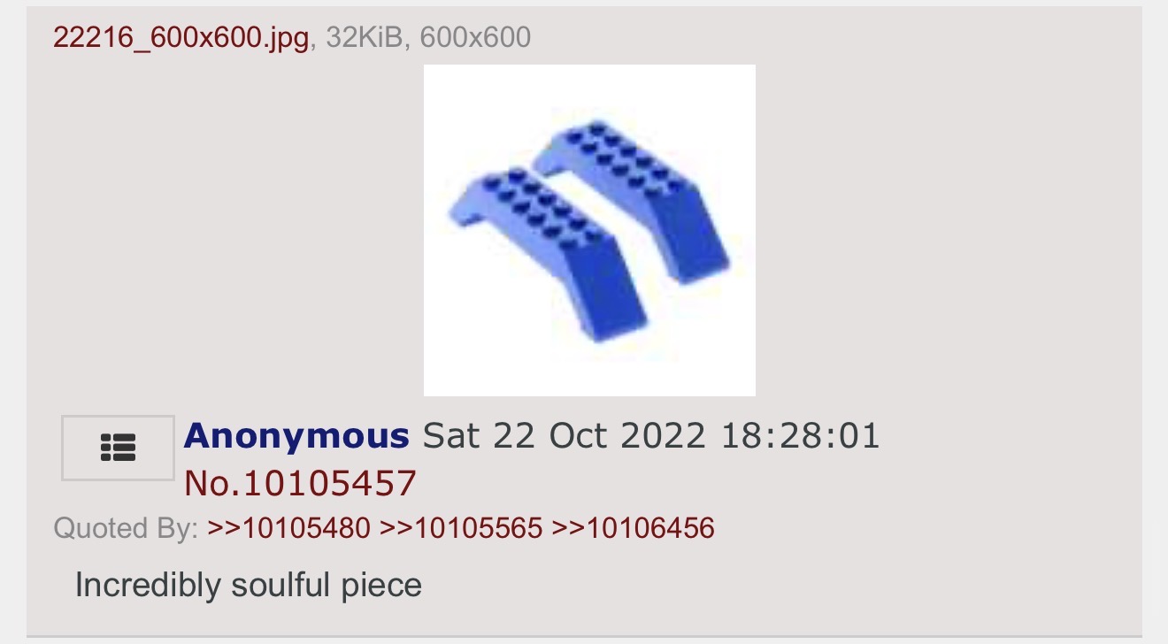 >>11741444>>11741444>the shill posts>conversation ensues, both critical and hopeful, mundane and pro-fane, often funny (recall the reaction to the soccer sets, very lively) but always pertaining to Lego itself>the anti-shill posts>we are in a samsara-like trap of endless meta-conversation about the state of — and who’s to blame for — other meta-conversations, punctuated by frequent, ugly descriptions of torture and suicide>>11741441I’ve been meaning to upgrade my CMF Basil for what feels like years now. No idea where my OG ended up