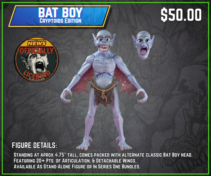 The Cryptoids Kickstarter finally got the Reptoids unlocked: green, blue, albino! They also have an officially licensed Bat Boy that you can add too.