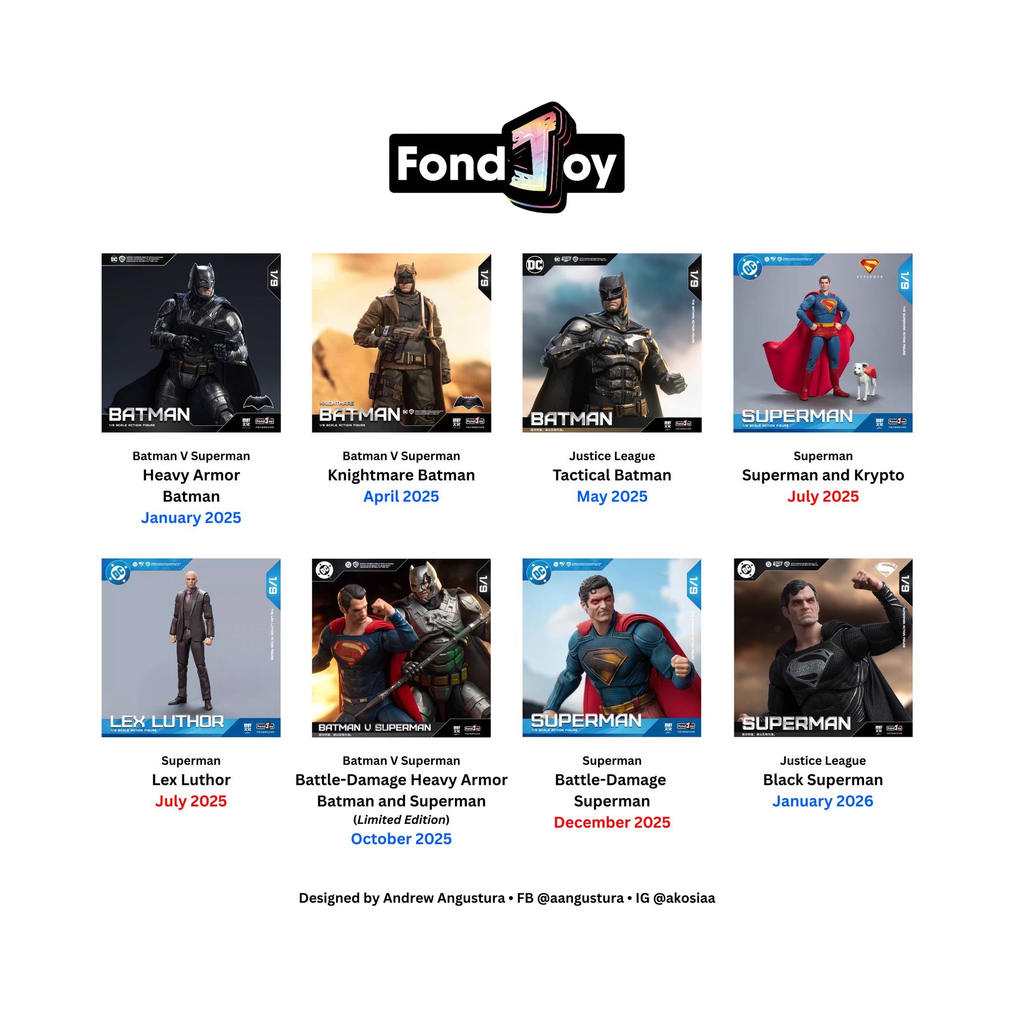 There are rumblings online that Fondjoy might be done, so if you are interested in their figures, it wouldn't be a bad idea to pick any of their figures now before they shoot in price. Currently, they have already discontinued a bunch of figures:>Both undamaged versions of Gunn's Superman>Both versions of BVS, and JL Tactical Suit Batman>Both versions of Battinson>Their entire first wave of DC figures