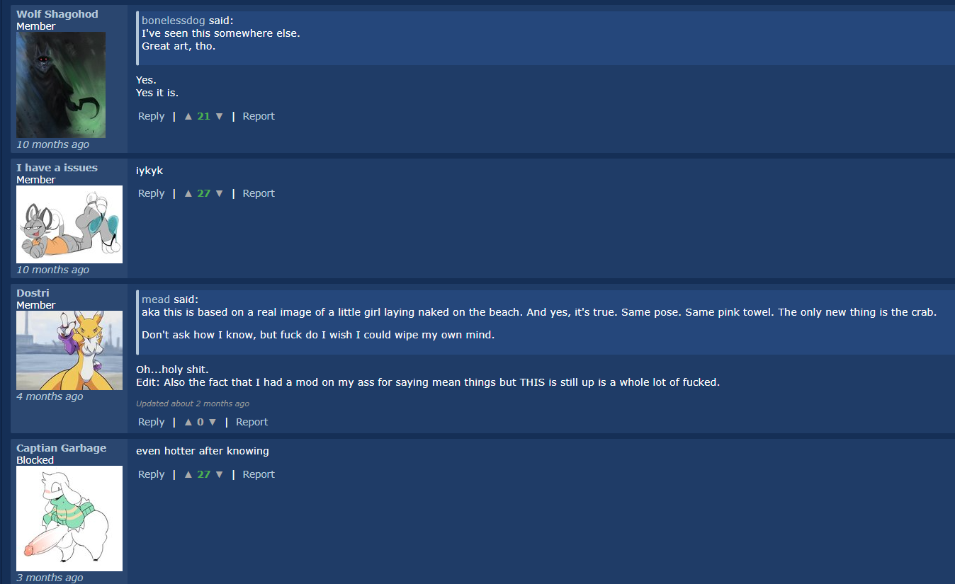 /acrg/ - lolicon is pedophilia General #1005The end of discord grooming EditionRemember to SCREENCAP your links so we can laugh when they delete their posts.Talk about artists or commissioners, mostly the bad ones or those who got under your skin. Share your experiences and get angry with us.For all artists (and commissioners who are close friends with artists) here, beware of: Horu, Pixxy, OkiOppai, Timedwatcher, AnythingGoes, Skitterleaf, kathielnotfound (Jocelyn Jones), and Snoopcrow/jbunny/j6un9 (jbunny).List of artists using AI to fill commissions or patreon posts: azoomer, hospitallerinaboat, ineeda_arts/ineedanaccount, plutoumbreon, sallandril, derickk76They will exploit and/or scam you should they get the chance.Last Thread: https://desuarchive.org/trash/thread/81030523