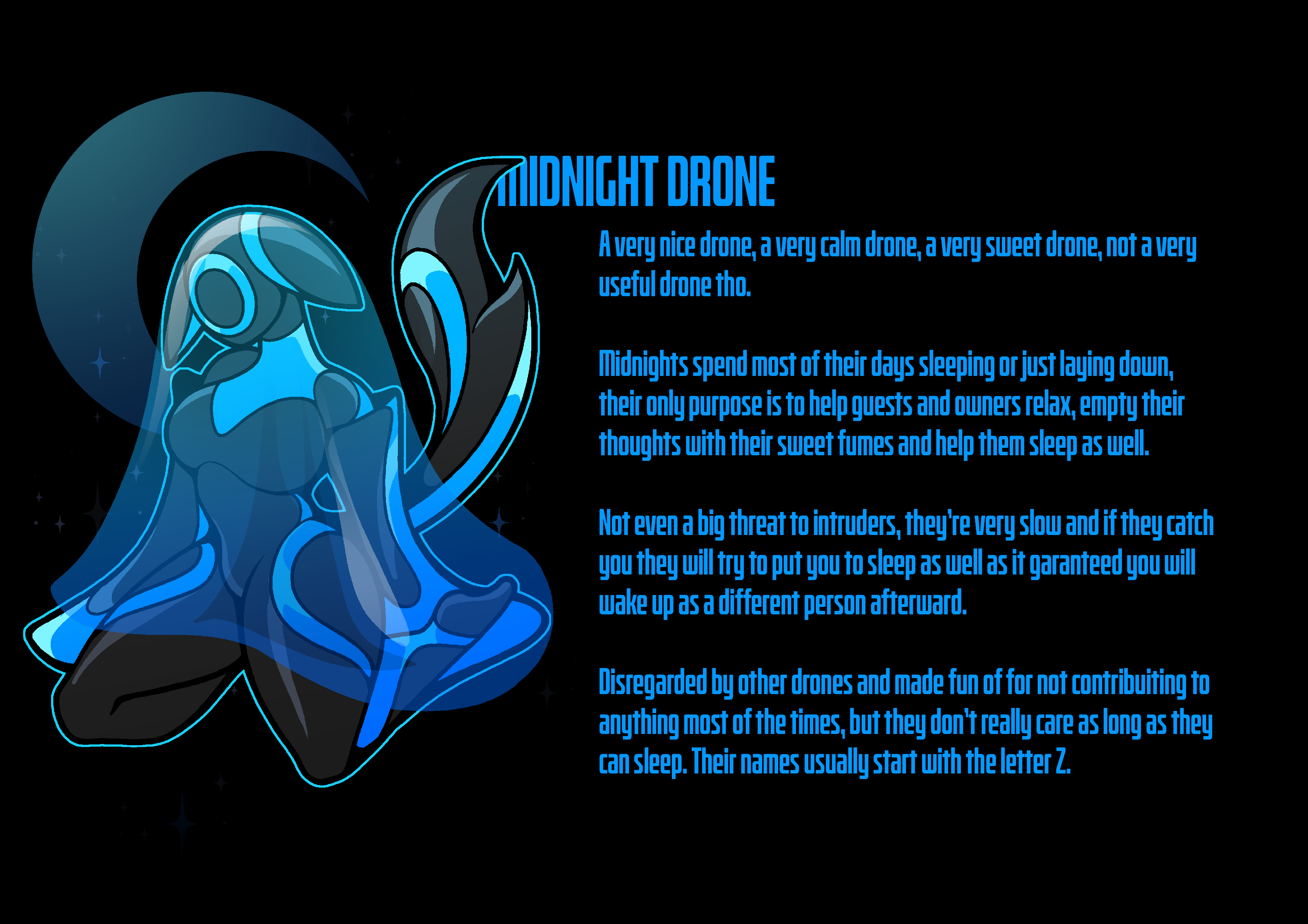 This won’t work but i’d like a story about being transformed into a Midnight Drone while it rains.Just something really comfy and relaxing and cuddly so I or anyone else reading can calm down