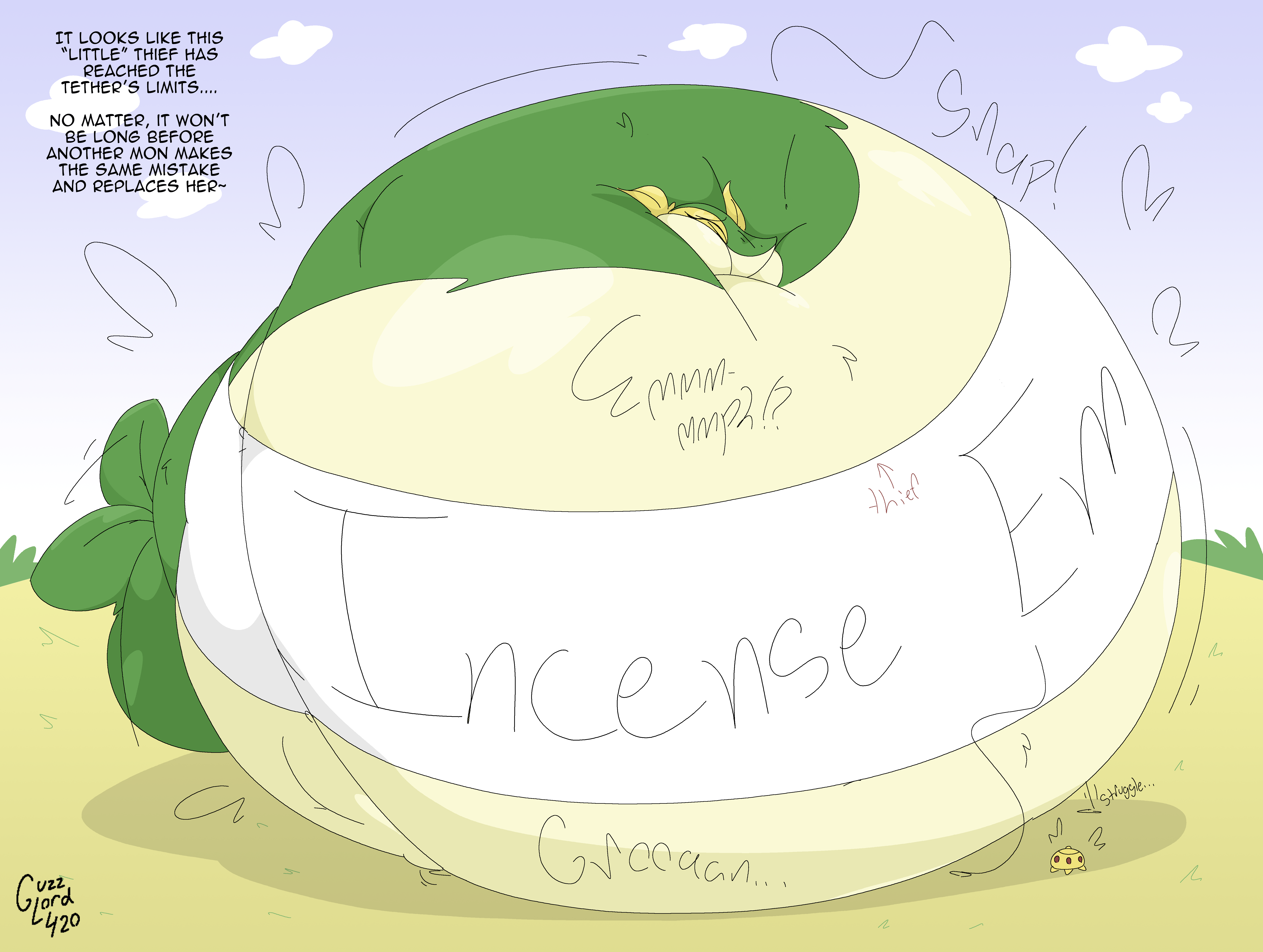 >>80643378Mffh, gosh... to be reduced to a mere balloon. All that taut, creaking hide slowly stretched out over weeks. There's no deflating now, I'd never return to my original lithe shape, overinflated and packed full of so much pressure that my original body is totally gone. Even if I were to deflate, I'd be like a flat, uninflated balloon. Now I'm just a buoyant parody of a Snivy, utterly huge and swaying in the breeze, utterly addicted to the feeling of getting bigger, lighter, tighter. I embrace my fate as a blimp, not that it matters now that I'm just living company property. Exhibitionist tendencies make me flush with equal parts arousal and shame, blown up into a literal hot air balloon as other Pokés gawk and whisper. The thought that they might take notice of the blimp overhead getting horny makes me tremble in excitement and mortification... That's when I'm snapped out of my trance by my tethers being pulled, buoyed over to where all the helium is stored. I'm not at my maximum sized yet, not by a long shot. A Snivy doesn't make the flashiest balloon, using me as a test run to make sure I don't explode first. Then they'll try it out on other candidates, one of which is a stunning Hisuian Zoroark with a gorgeous flowing mane.Time for yet another gaseous top-off...>Hissssssss...~