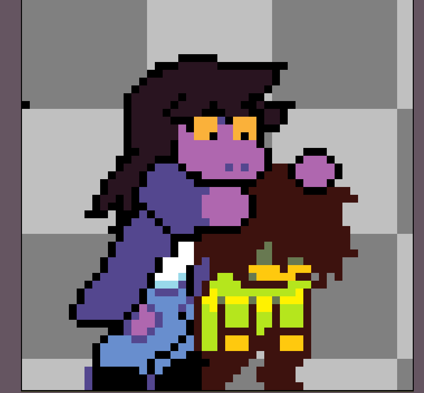>>80587581Hello. I make mods. I'm making a mod that makes some of the sprites more consistent.I've made Susie's eyes and teeth the same color across all 4 chapters, I've returned Ralsei's ugly spade thing on his rob in chapter 2 to a heart the way all the promo material presents it as. Now, I have redone a few sprites that have gone unnoticed for years.Did you know that the Susie Rudebuster sprites change the lining of Susie's jacket pink for this one animation? Weird, right? I made it purple