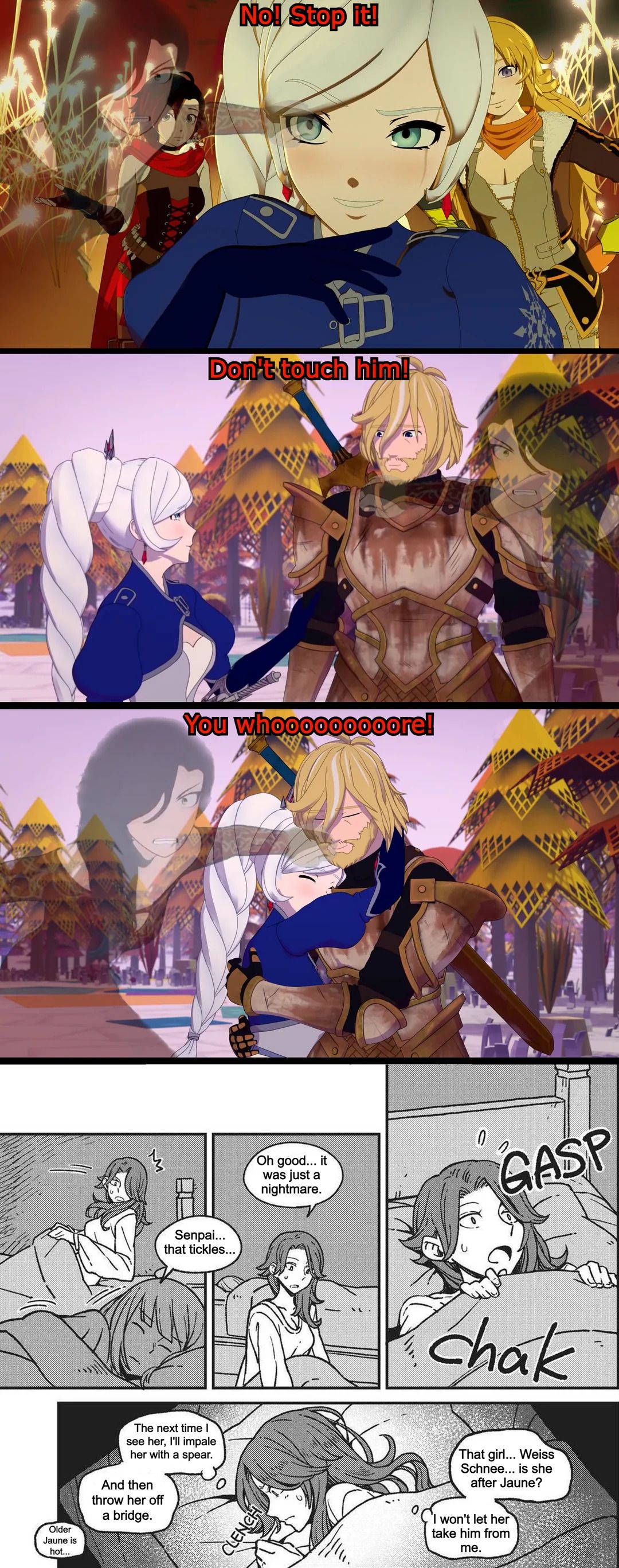 >>80569723Ren is a tragic case where more screentime he got, the more pathetic he became:>went from quiet martial arts master to loud jobber>his tragic backstory was his entire village & family getting obliterated by one Grimm and he wasn't even allowed to get proper revenge>At start Nora was the one obsessed with Ren, but that got flipped other way around which turned Ren's image from confident chad to insecure simpMost brutal comparison to illustrate this I can think of would be the image where first part has early-season Nora praising Ren as ninja with the pun being Jaune's fighting skill and lack of it whereas this is flipped around in later seasons with Nora praising Jaune and mocking Ren instead