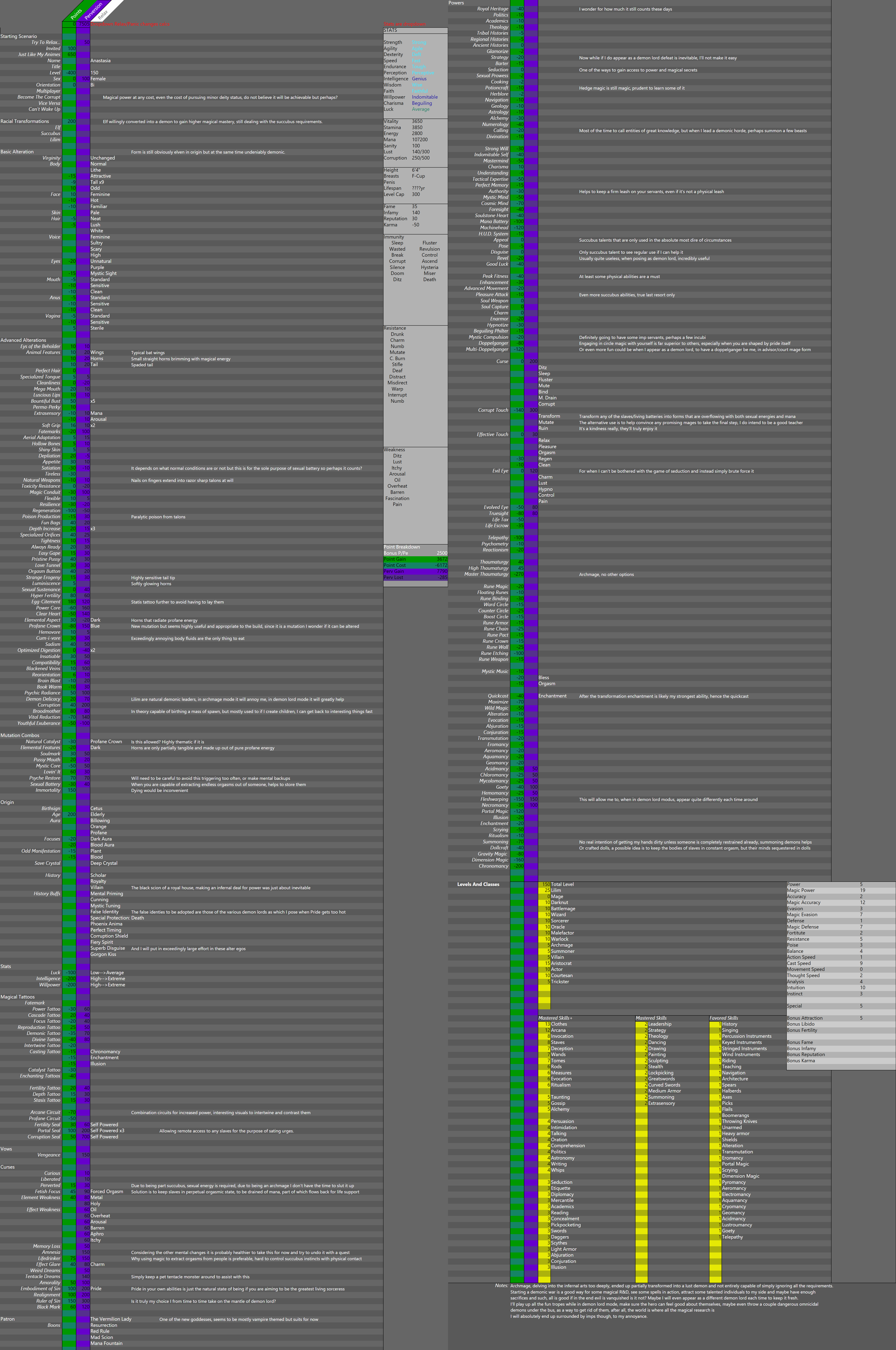 Got inspired by the last thread talking about tentacle realm to give it a shot of my ownEnded up going maybe a teensy bit too far in the way of villain status along the way, but then ended up leaning into it, what I'm going for now is to just be Lilim archmage most of the time, then occasionally give in to the Pride urges and lead a demonic hordeBut not as myself, but rather taking on a different demon lord persona each time, with the expectation that there will be heroes that will put an end to my march eventuallyBut while it's happening, lots of time for some debauchery, field tests of new spells and seeing what happens to various demons I can summon, including intentionally summoning a few of the more omnicidal ones to get them killed off before they can get summoned by a dedicated cult Then quietly slink away after defeat to my tower, which of course is still filled with permanently orgasming slaves/mana batteries, but I'll see if I can't get volunteers for that, with the promise of doll bodies their minds can retreat into when they want to escape orgasm hell Not a good image yet since I'll likely be abusing fleshwarping to change my looks when I want