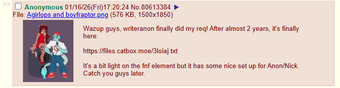 Stories:By Raconza>Without You in the Darkhttps://desuarchive.org/trash/thread/78166688/#q78219783By LizardBro>Wingman Chronicles 2https://rentry.co/hw7ruhqbBy Raconza>Dragon's Duethttps://desuarchive.org/trash/thread/76483080/#76493589By Indianon>Susie's Birthday FavorComment too long. Click here to view the full text.