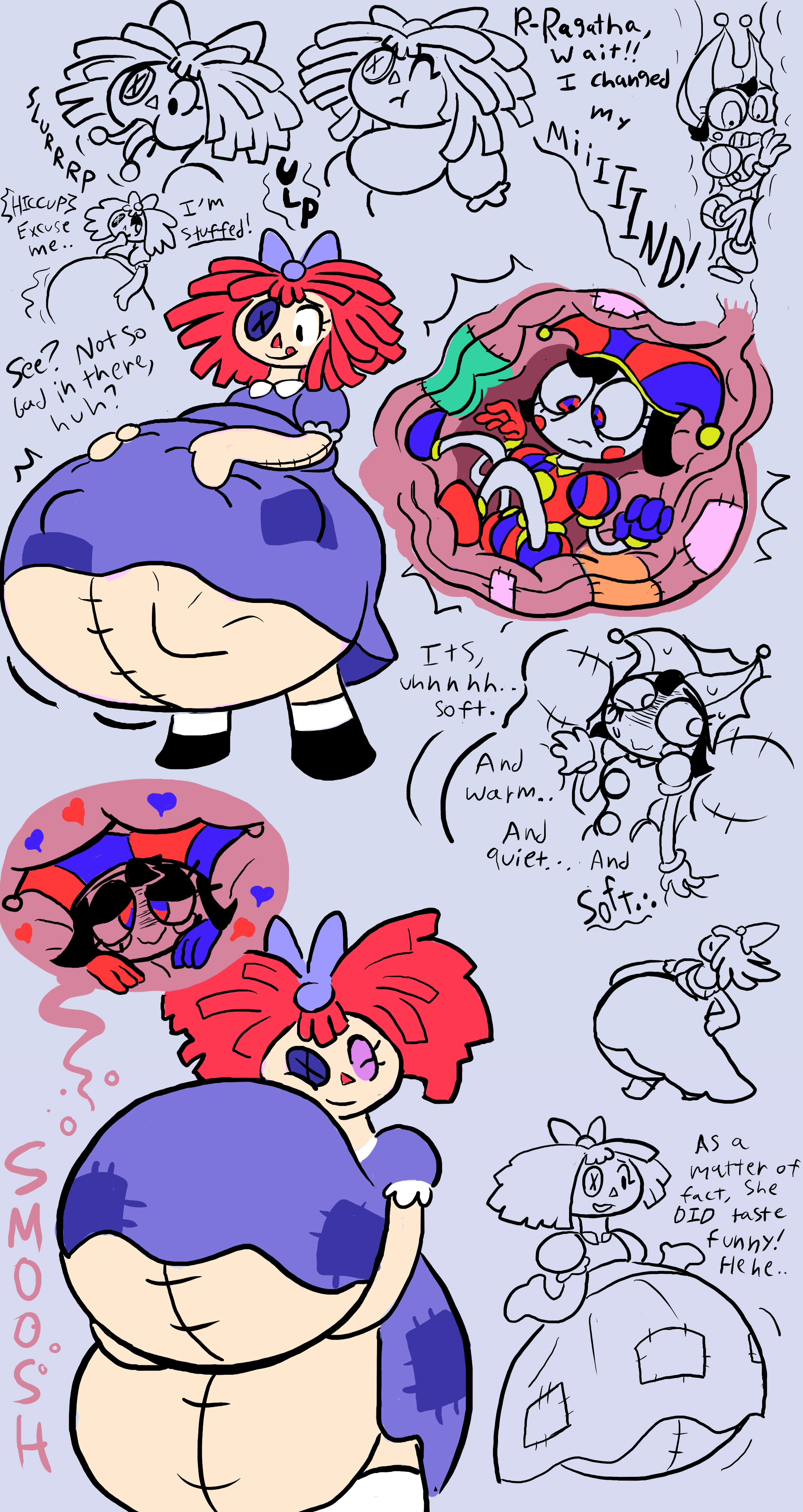 >>80115665>>80115685I got a funny idea for Digital Circus vore. Say Caine bans anything sexual because it's "inappropriate", but the people there still have sexual feelings & urges they wanna act out. What if the cast starts doing vore and other weird fetish stuff with each other, and tell Caine it's just "cartoony gags" to get away with doing it. Kind of like how AI chatbots won't let you do sexual stuff but let you do vore. Except literally because Caine's an AI lol.