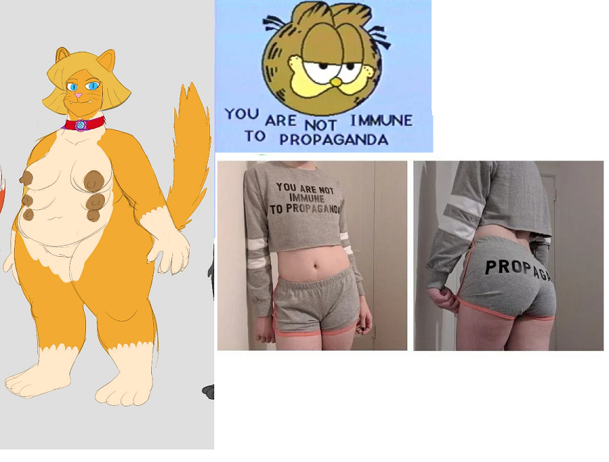 >>80318508Requesting adult Clover as a BBW cat anthro wearing the "You are not immune to propaganda" outfit while having the same expression as Garfield.