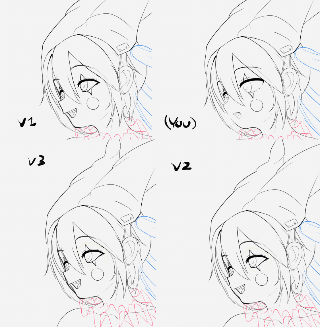 >>79904068Don't see the image or what I'm about to say as a critique. I feel like your image is currently good enough on it's on to not require one (I believe the stylization you're going for is cute and is reminiscent of the era of anime you are going for)I have provided possible alternatives incase you were interested in going in this possible directions when it comes to the eyeshape and the face shape/mouth shape.