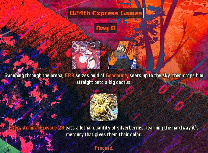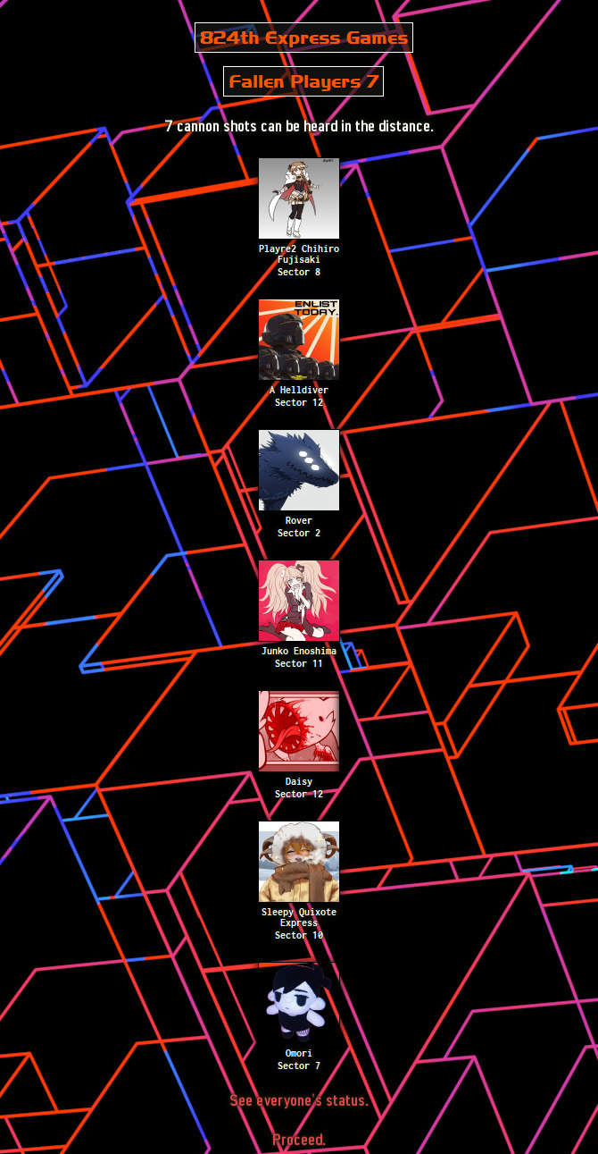 Location: Santa's Workshop, 2025 edition>The place to be for murder simulations, and RP.>We periodically host a web-based battle royale that can include anything and anyone. Shenanigans ensue, and some people attempt to write it into semi-coherent narratives, playing the parts of the characters within! Check here for additional details:https://rentry.org/HungerGamesHostingGuideUpdatedhttps://brantsteele.com/hungergames/