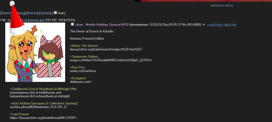 The Home of Doerot & Kriselle.Krismas Present Edition>Relive The Doerot:desuarchive.org/trash/search/subject/%2Fdoe%2F/>Temporary Gallery:mega.nz/folder/TGJRwabb#r86F4JdQw54UBpO_j2OPEA>Doe Ficsrentry.co/DoeRecs>Doegame:deltarune.com/Comment too long. Click here to view the full text.