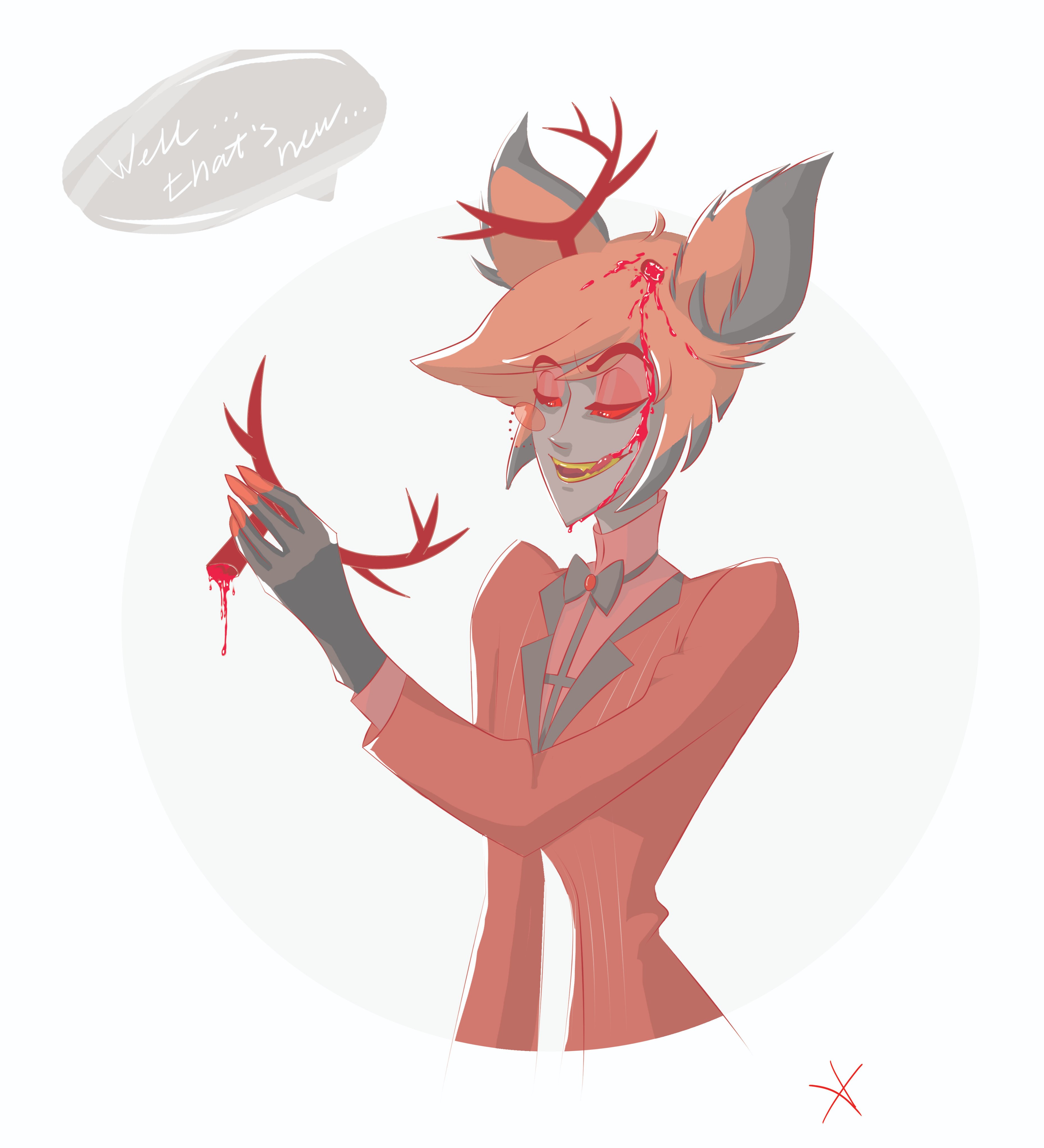 >>80080146I don't think anyone here likes Alastor just because he's popular, more in spite of his popularity. Having to see all the shit takes from the fandom about him, and other so called yumes who don't seem to care about him other than him being hot is true suffering. As for my own feelings, well I still feel affection for previous faves even years later, though I never liked any of them to the same extent I do Alastor. We still have several years of Hazbin left, who knows for sure what will happen. Real life couples fall out of love and split up all the time.>>80080188He probably doesn't shed his antlers canonically, but it's a neat concept and I enjoy seeing it in fanon. I bet he would keep them. >>80080413>artists forget to draw his antlersThe amount of times I've liked a piece of art and then it's popped up a little later again with a note about how they forgot his antlers... Also his monocle. Conversely it also makes me chuckle when they draw fem Alastor and still draw the antlers.