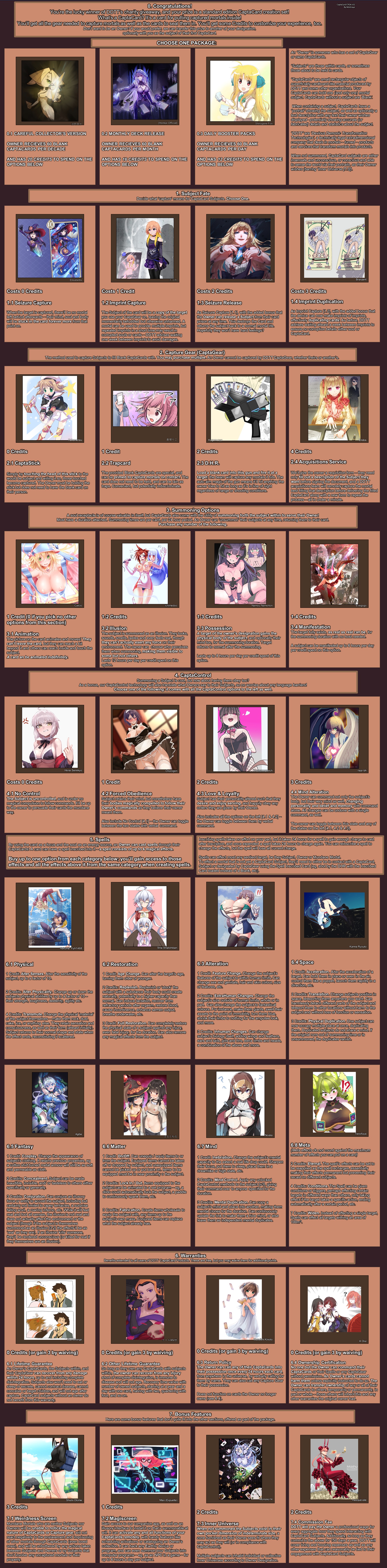>>82076214>summoning cards that summon the CaptorYou couldn't fit a deck into a card though. Well, maybe if you were super badass at conjury you could do a small one and have it work, but not one of a size that an experienced captor would actually useI think a skill about duplicating cards would be excessive, but perhaps there could be more language about how card duplication works included somewhere in there.What would be the purpose of a phylactery skill here? Why not just Phylactery yourself?Sacrifice was already meant to do that, maybe the wording was just unclear.>>82086853This is cool as hell. Please be aware that this level of analysis could be impacted by changes since it's still a WIP – not that I have plans to undermine you or anything, but details will definitely be refined before release.You can capture things in dreams, but they'll be dream things. I don't know exactly what effect that would have.A Resurrect card wouldn't completely bypass the downsides, they'd still be applied when you played the card. But you can equip it and make someone else have the downsidesComment too long. Click here to view the full text.